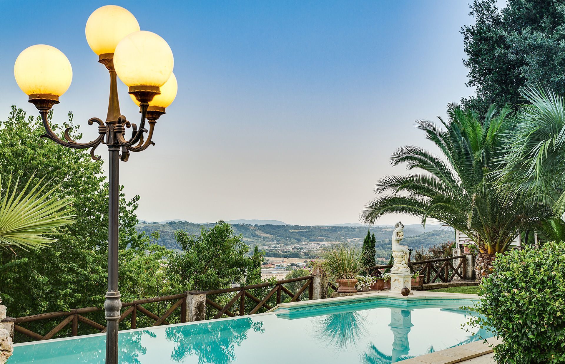 The grounds are gorgeous and include a lawn, infinity pool, hot tub, laundry room, BBQ, outdoor tables and chairs and a breathtaking view of the countryside. Willow trees grace the property, the infinity pool is trimmed with lovely statures, and the playful swing hanging from a tree is inviting, even to adults. The birds will sing you a chorus every morning and throughout the day. In the evenings, you can sip wine while looking at the twinkling lights in the valley below, listen to the splashing fountains, and imagine for a moment that you can stay there forever. You will feel like a local living on a hillside in Tuscany.