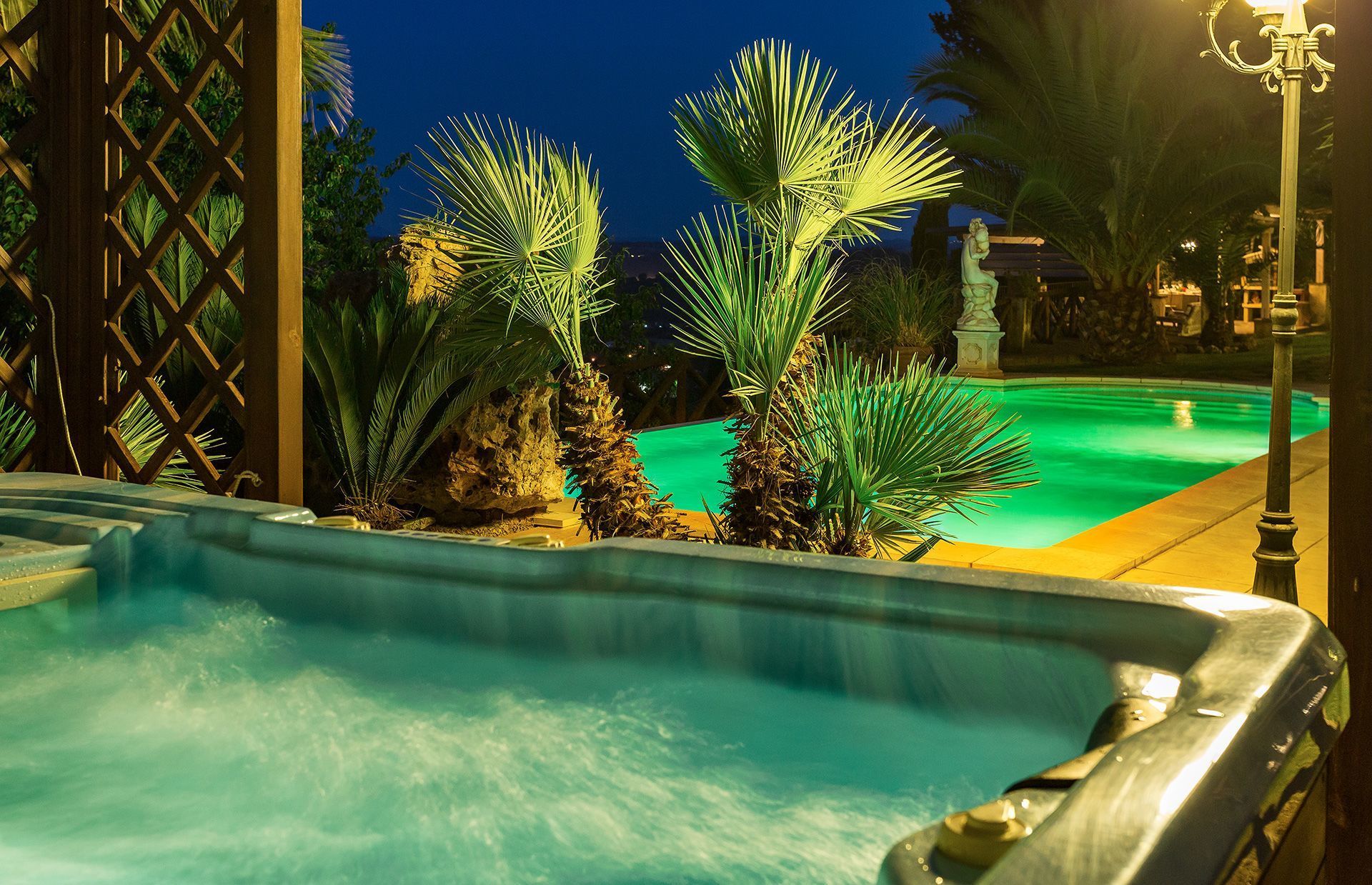 The swimming pool has a roman style shape with steps gradually leading down into the water which is slightly salted. The pool has two hydro massage corners, an infinity edge and is particularly beautiful in the evening as its lights change the colour of the water creating a romantic atmosphere. The hot-tub should be reserved in advance.