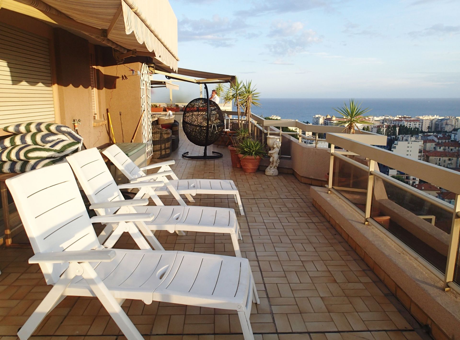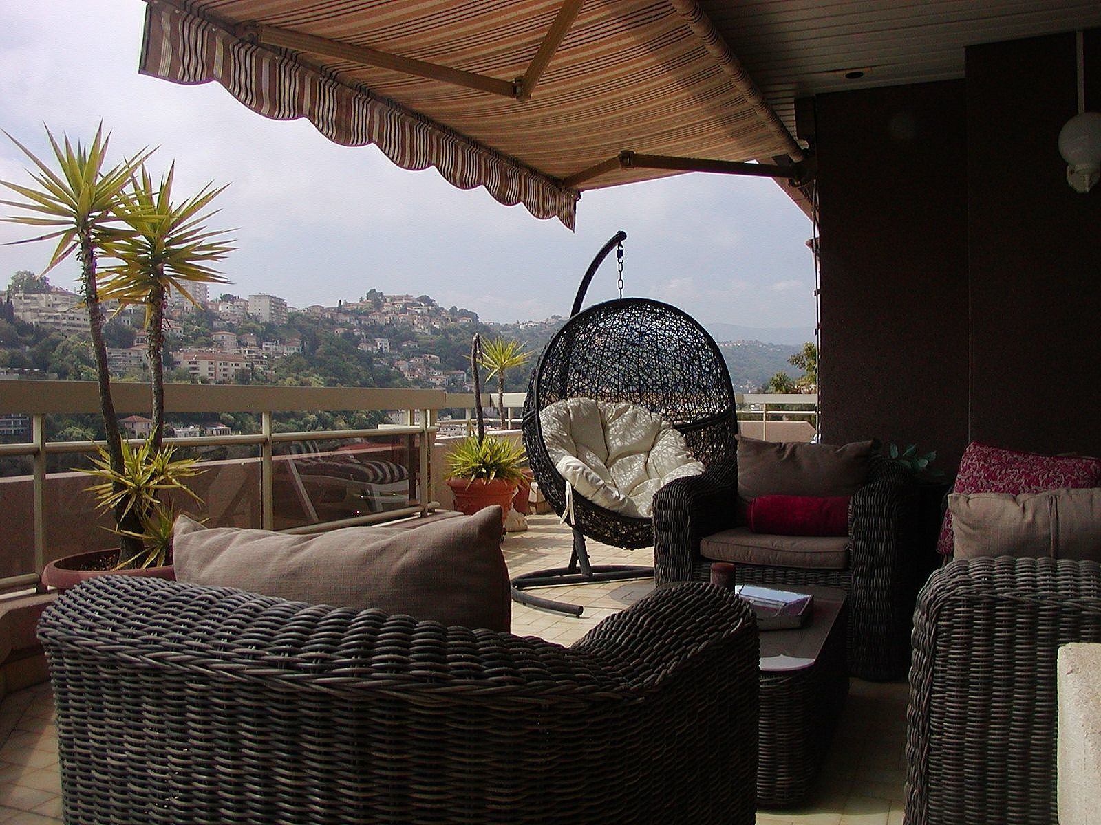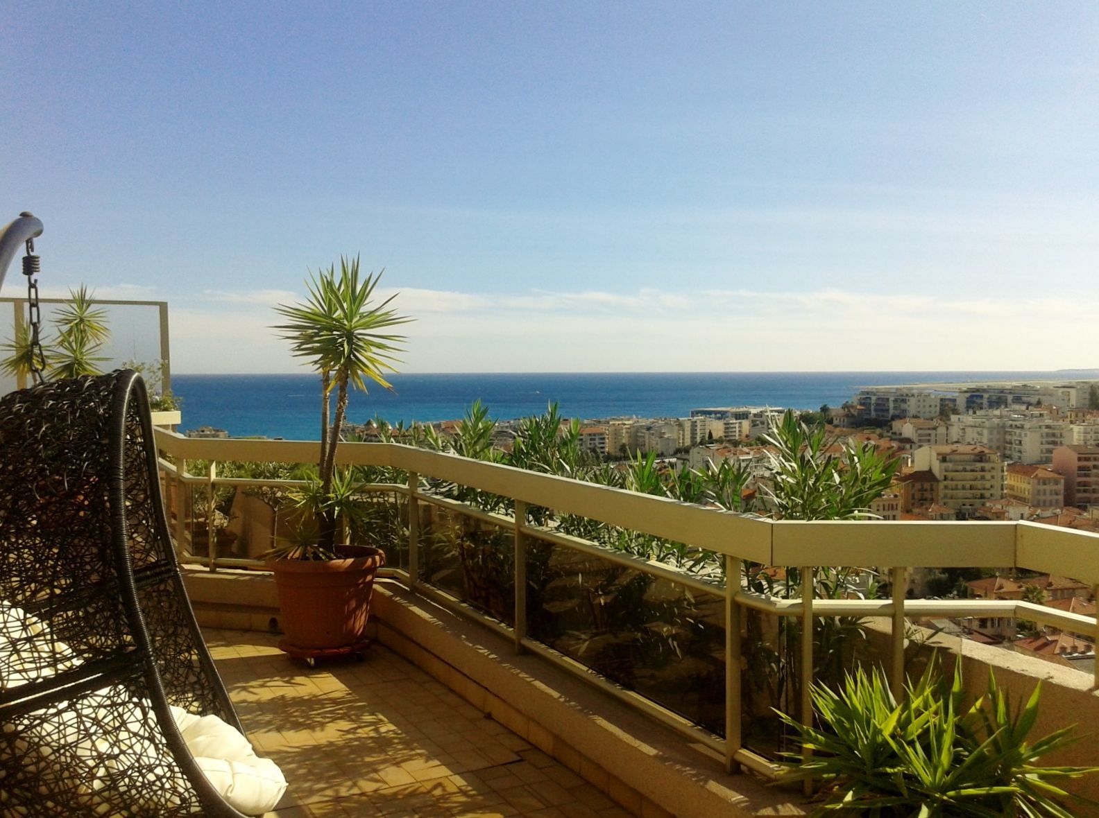 Skøn lejlighed for 6 personer med 2 soveværelser i gå-afstand til stranden i Nice, Cote D'azur. Lejligheden, som er på 100 m2, er beliggende på 5. sal i et stort domaine med park. Domainet er sikkert og lukket med elektrisk port. I kælderen er en garage med plads til to biler. Fra den store terrasse på 120 m2, som går rundt om det meste af lejligheden, er der udsigt dels over en stor del af Nice by, men også en smuk havudsigt. På terrassen forefindes havemøbler, spisekrog, et hygge/ sofahjørne, samt en barbecue, så der er alle muligheder for at nyde de lune sommeraftener.