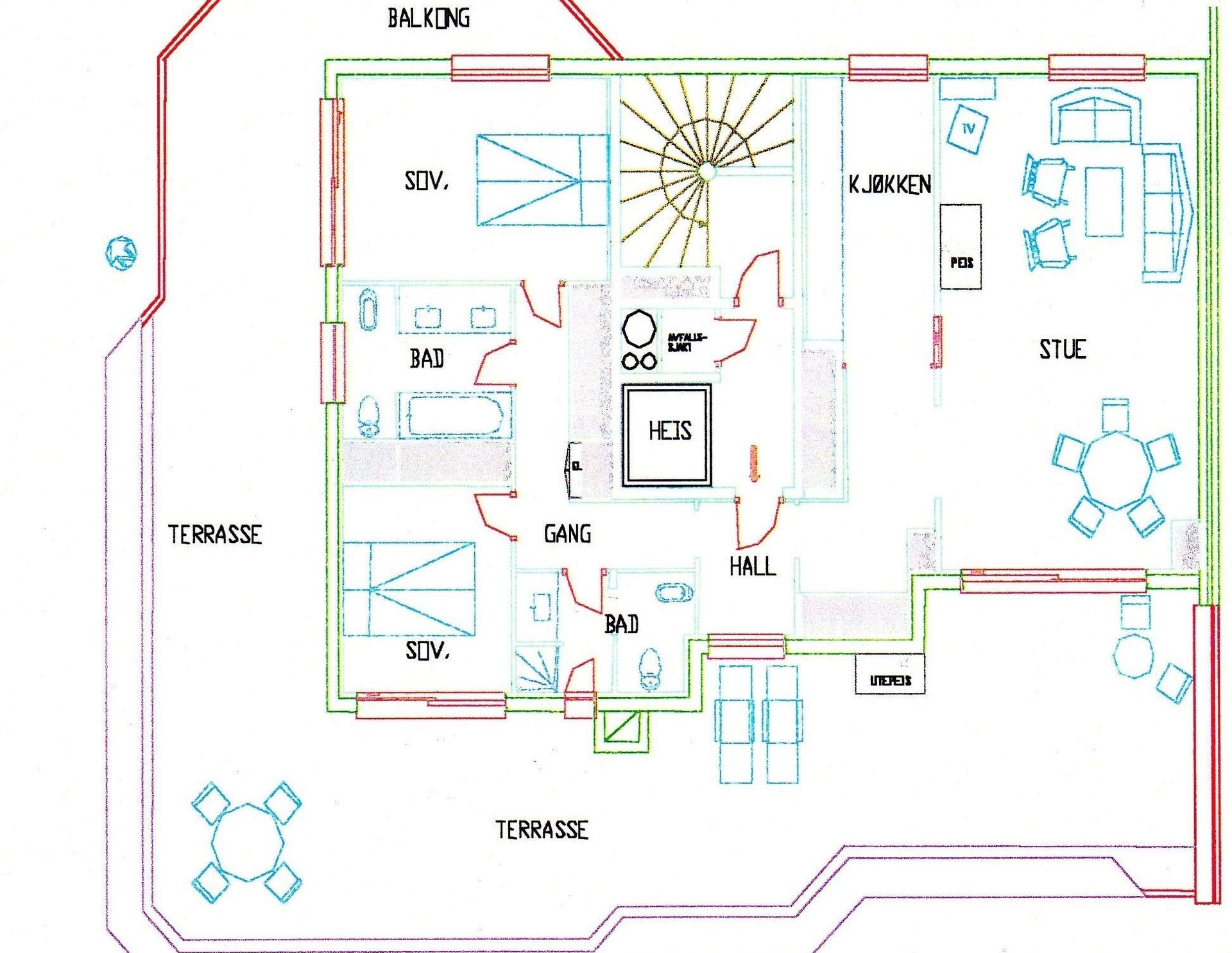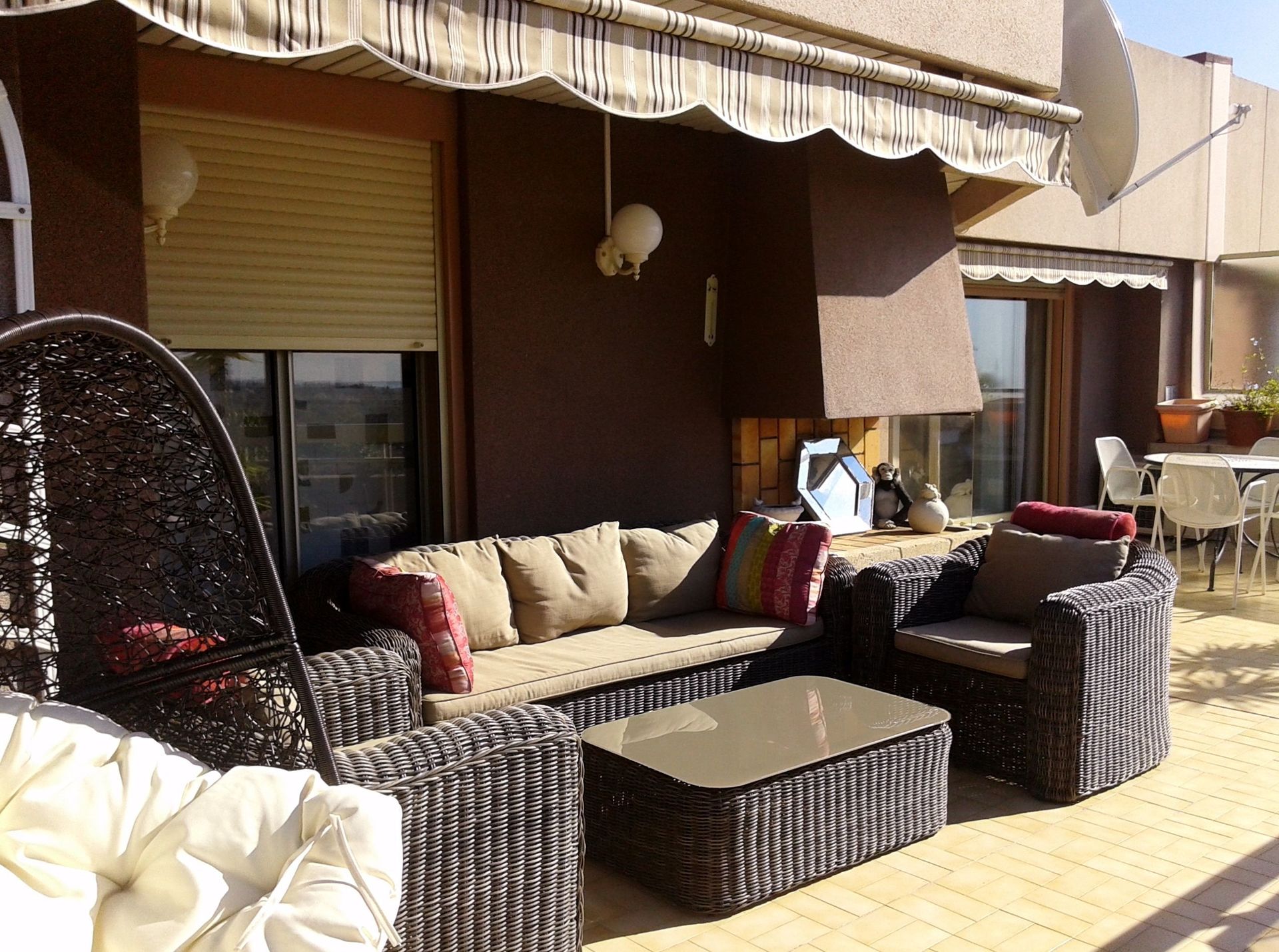 Privat udendørs område: Stor terrasse på 120 m2 med spisehjørne, sofagruppe og barbecue.