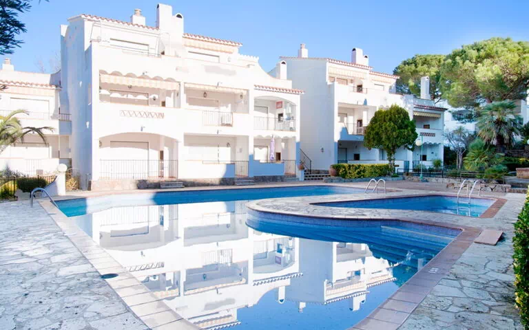 Puigrom: Child friendly, modern residence "Els Jardins II", renovated in 2016. In the district of Puigrom 3 km from the centre of Roses, in a sunny position on top of a hill, 2 km from the sea. For shared use: garden plants and trees, swimming pool angular (14 x 7 m, seasonal availability: 01.Jun.-30.Aug.). Children's pool, parking space n 22B. Supermarket 2.5 km, restaurant 3 km, bus stop 2.5 km, railway station "Figueres" 15 km, sandy beach 2 km, indoor swimming pool 4 km, swimming bay 6 km. Sports harbour 2 km, golf course 15 km, tennis 4 km. Nearby attractions: Parque Acuático Aquabrava 6 km, Centro paracaidismo y túnel del viento 11 km, Museo Dalí Figueres 23 km, Casino y festival de Peralada 24 km, Monasterio Sant Pere de Rodes 24 km, Cadaqués Cap de Creus 32 km. Please note: car recommended. There are more similar properties for rent in this same residence.