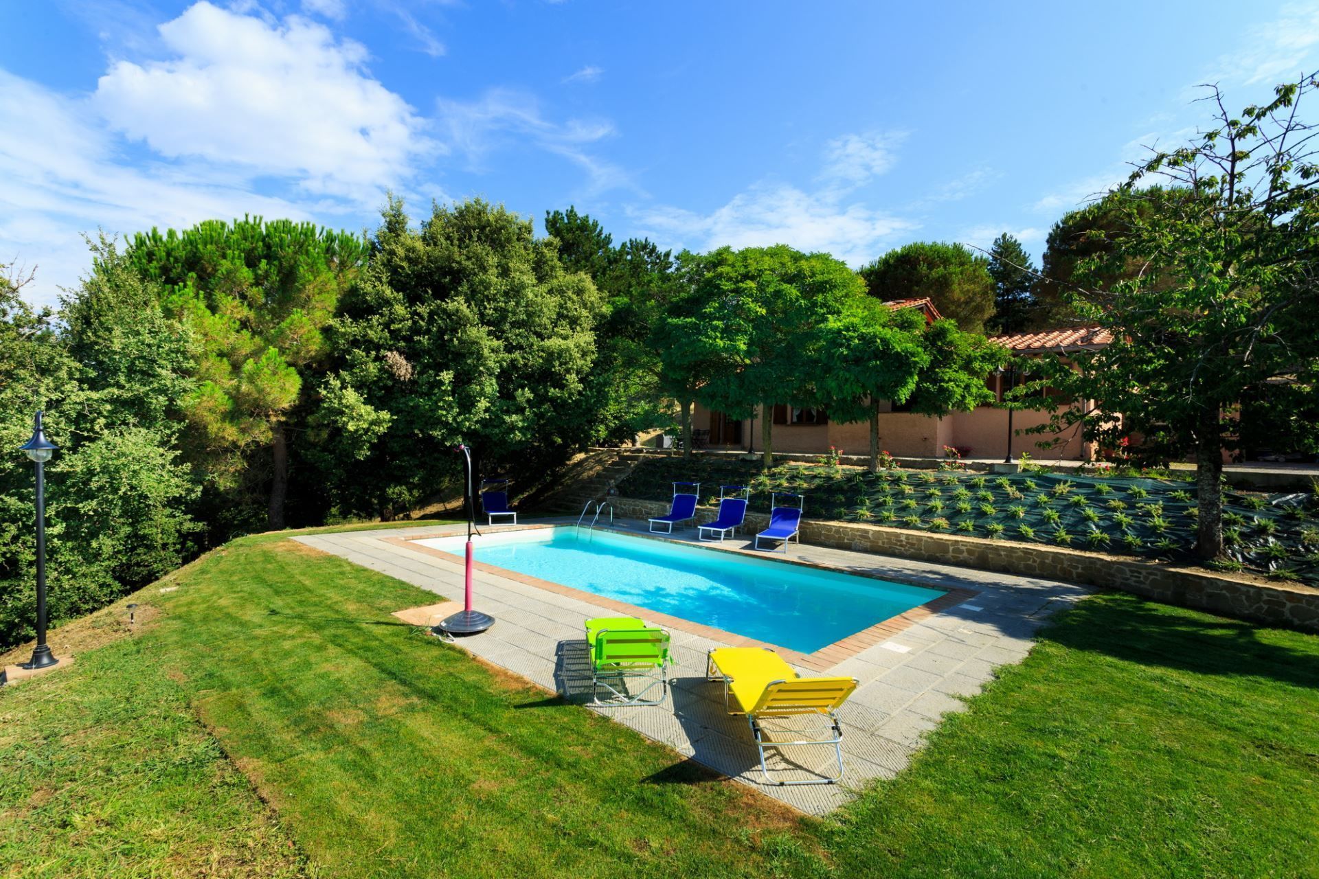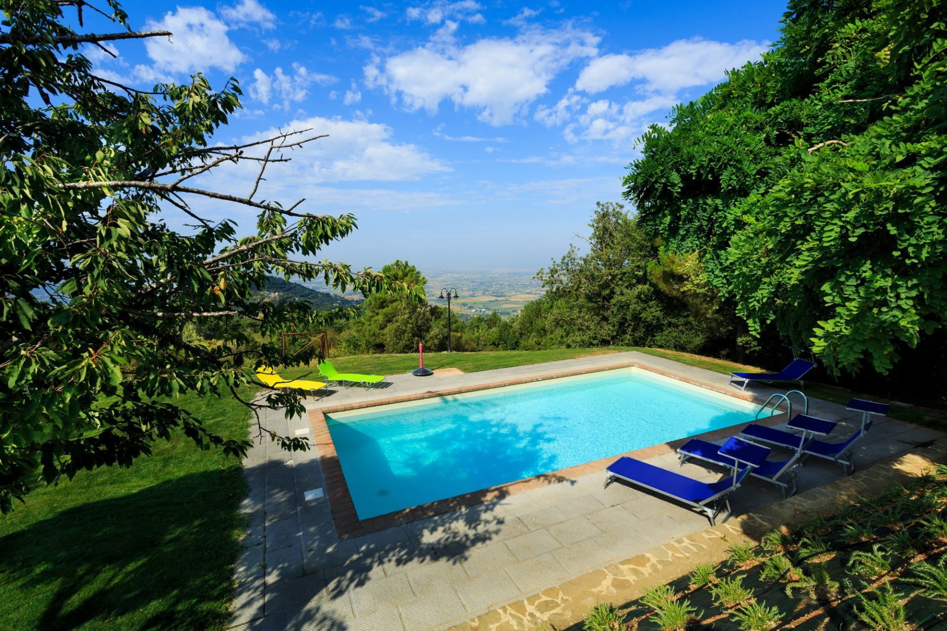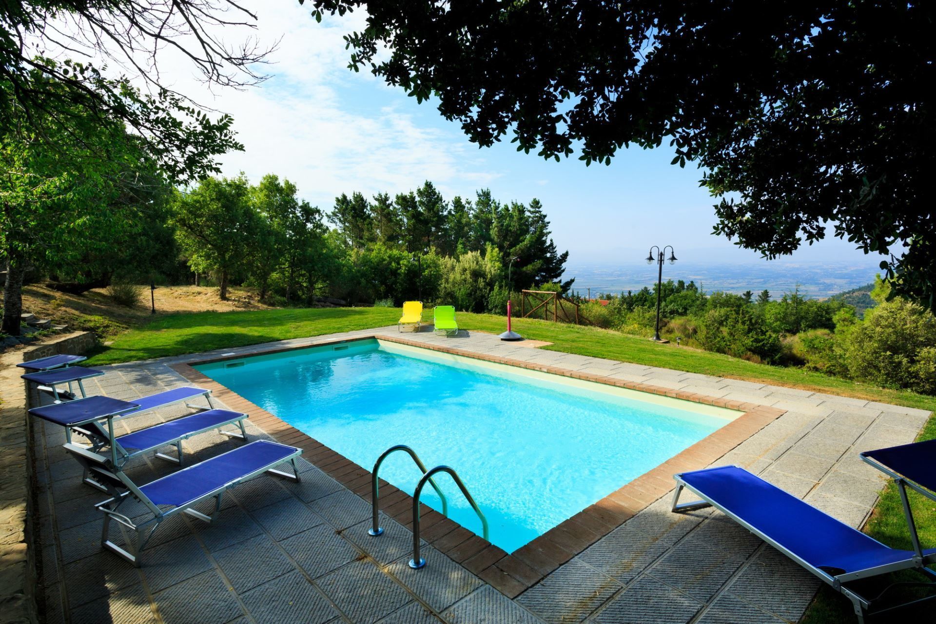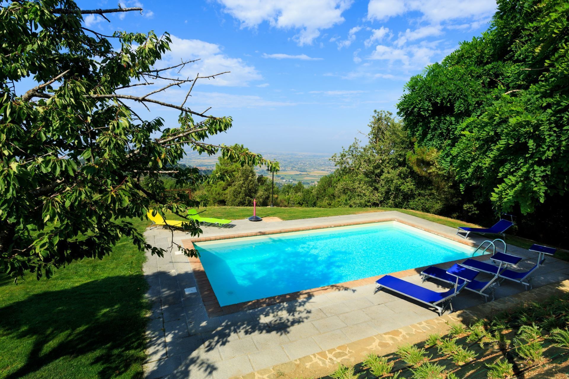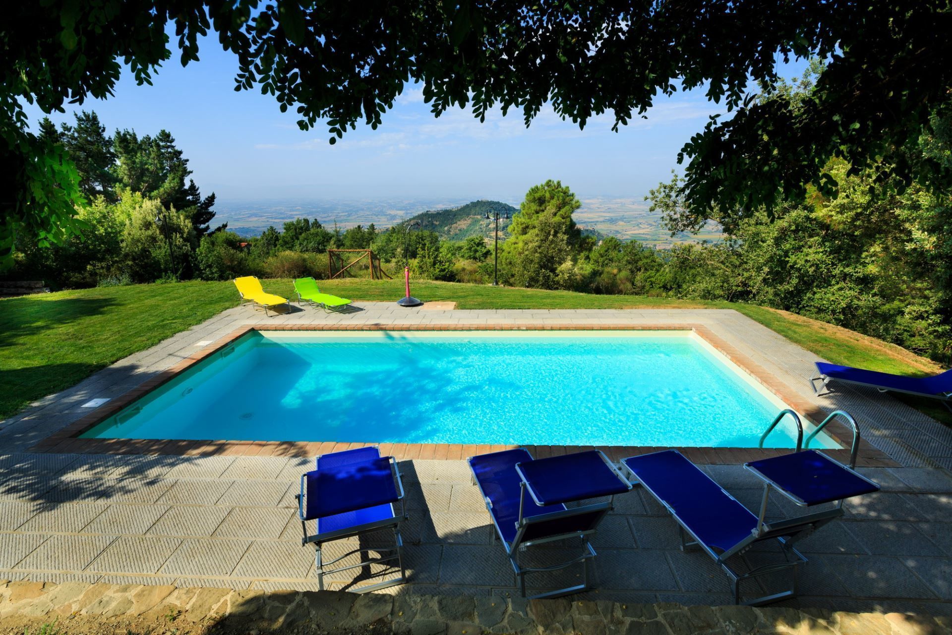 Magnificent view on Valdichiana Valley, Cortona and Trasimeno Lake. Casa dello Scoiattolo, set 750 mt above sea level, surrounded by pines, cherry and acacia trees is placed in a very panoramic position only 5 minutes driving from the centre of Cortona. From the swimming pool and from the villa you can enjoy a great view on the Valdichiana, on Cortona and Trasimeno Lake.