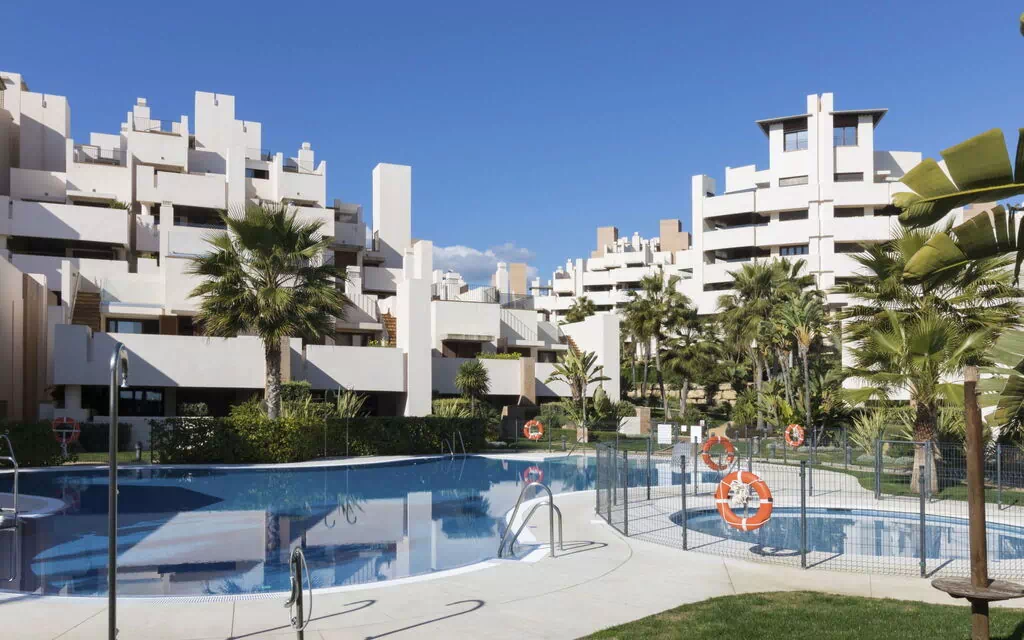 Meget moderne, smuk flerfamiliehus "Bahia de la Plata". I distriktet Estepona, rolig, solrige beliggenhed, 150 m fra havet, direkte adgang til stranden, retning syd. Til medbenyttelse: have i forskellige niveauer, 2 swimming pools (Sæsonbestemt tilgængelighed: 01.Jun. - 31.Sep.). Børnepool, udendørs brus, boblebad. I anlægget: fitnessrum. Parkeringsplads. Indkøbsforretning 1 km, supermarked 1 km, indkøbscenter 10 km, restaurant 1 km, bar 1 km, bageri 1 km, fodgænger zone 100 m, busstoppested "El Padron" 350 m. Golfbane (18 hul) 4 km. Emner egnet for 4 voksne. Bemærk venligst: flyveplads 65 km fra huset.