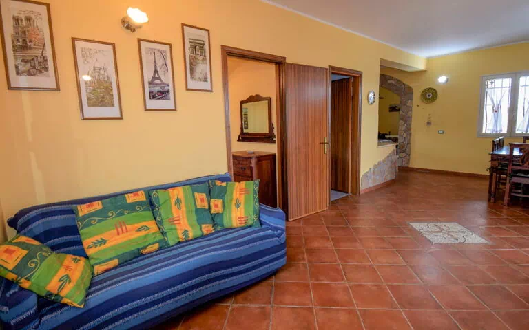 3-room villa 80 m2. Practical and comfortable furnishings: large living/dining room with satellite TV (flat screen). Exit to the patio. 1 double bedroom. 1 room with 1 bed and 1 pull-out bed. Open kitchen (5 hot plates, mini-oven, oven, freezer) with dining table. Exit to the patio. Shower/bidet/WC. Boiler (80 litres). Terrace 30 m2, roofed, large patio 80 m2, roofed. Terrace furniture, barbecue. View of the countryside. Facilities: washing machine, iron, hair dryer. Internet (WiFi, free). 1 small pet/ dog allowed.