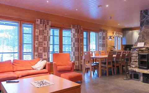 Downstairs there is a spacious living room-kitchen, bedroom with 2 beds (from the bedroom access to sauna's shower room), sauna, shower room (2 showers), dressing room, separate toilet and a covered terrace on the side of the fell. Downstairs is partly accessible for handicapped. Strips for wheelchair are available on request in advance for a half meter high entrance terrace. If necessary, please ask Lomarengas for details before booking.