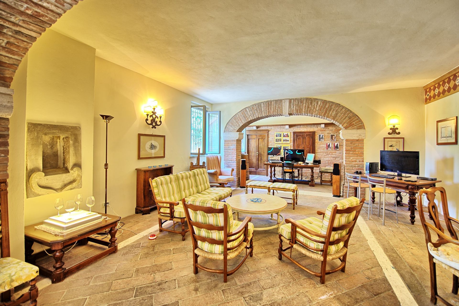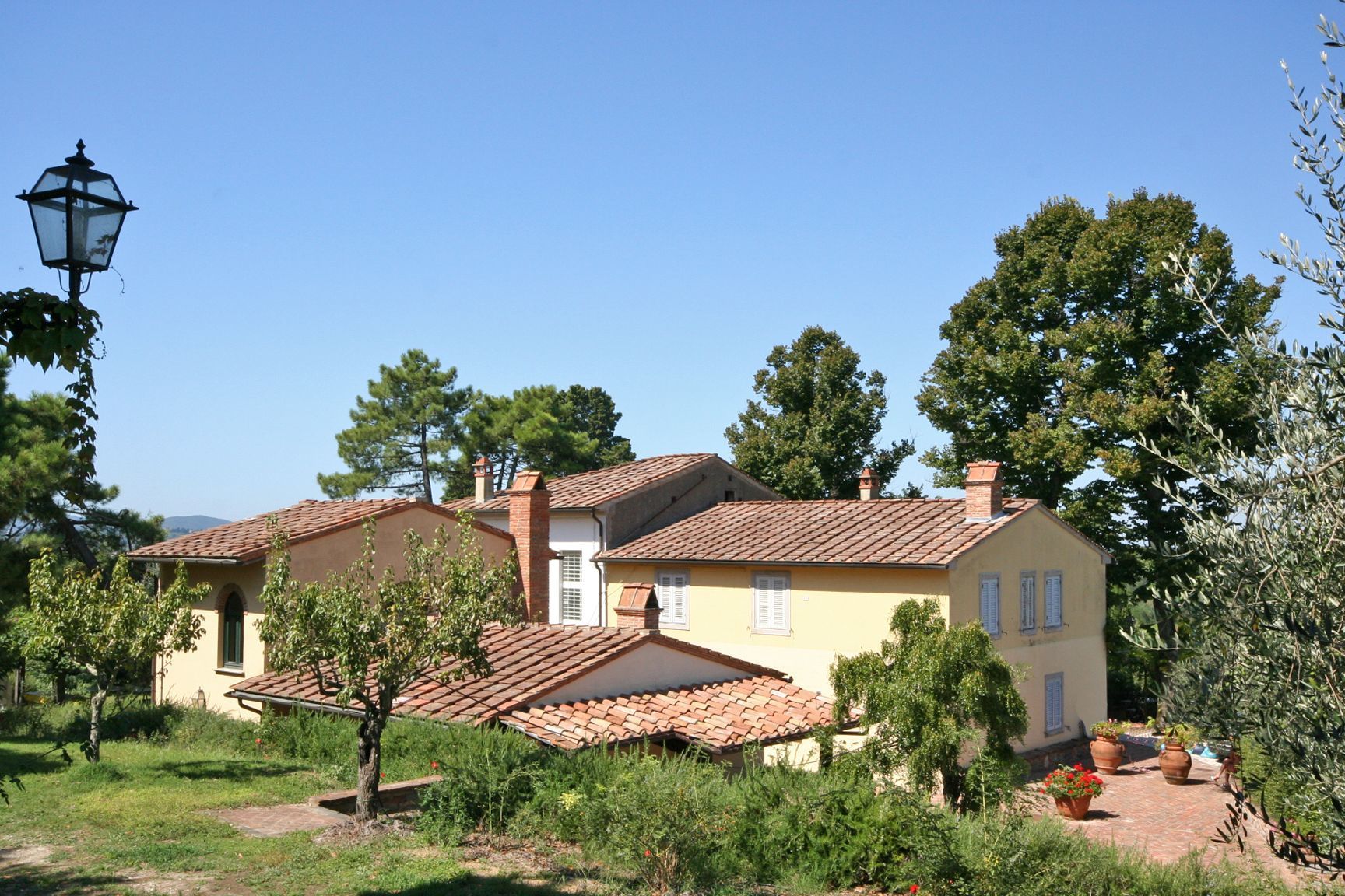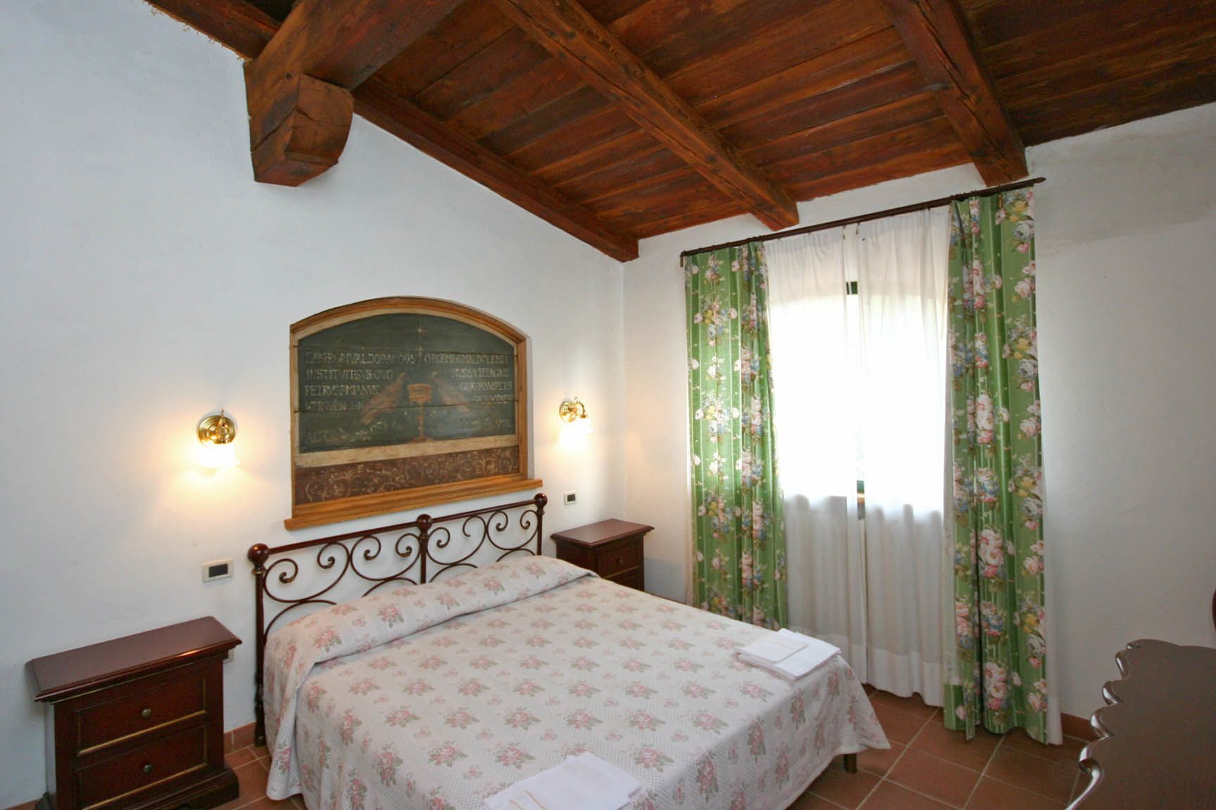 Ground floor (access through 4 steps): living-room with fireplace and large dining table, kitchen (oven), double bedroom, twin-bedded room, bathroom with shower. The bedrooms are provided with air conditioning.