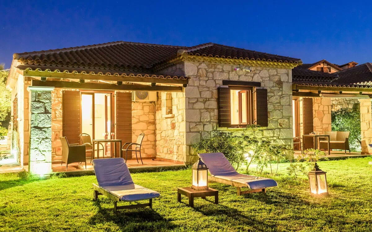 "Gerakari Junior Villa", 2-værelse-villa 55 m2. Komfortabelt og pæn indrettet: åben stue/soveværelse med 2 sovesofaer og sat-TV (fladskærms TV), cd og DVD. Udgang til terrasse. 1 åbent værelse med 1 dobbeltseng. Køkken (4 kogeplader, ovn, mikroovn, elektrisk kaffemaskine) med spisebord. Bad/WC, massagebruser. Klimaanlæg. Terrasse. Liggestole. Flotte udsigt over havet og landskabet. Til benyttelse: vaskemaskine, pengeskab, hårtørrer. Internet (trådløs LAN [WLAN], gratis). Velegnet for familier. 0428Κ91000391801