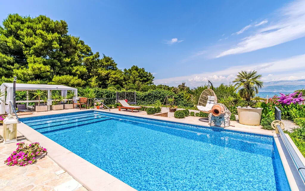 Mirca: Enfamiliehus "Villa Mutnik". 2.4 km fra bymidten af Supetar, isoleret, rolig, solrige beliggenhed, direkte ved havet, direkte ved stranden. Til alene benyttelse: grund 1'500 m2 (indhegnet), have med planter, pool kantet, med varme (10 x 4 m, 150 cm dyb, Sæsonbestemt tilgængelighed: 01.Apr. - 15.Nov.) med indetrappe. Udendørs brus, boblebad, terrasse (100 m2), grill (gynge, sandkasse). I huset: adgang til internet, trampolin, vaskemaskine. Til afbenyttelse: cykler (6). Tilkørsel til til huset (500 m natursti). Parkeringsplads ved huset på grunden. Indkøbsforretning 1.2 km, restaurant 1.6 km, busstoppested 4.2 km, kiselstenstrand 20 m. Enheden består af det lille separate hus og hovedhus, som lejes som en enhed.
