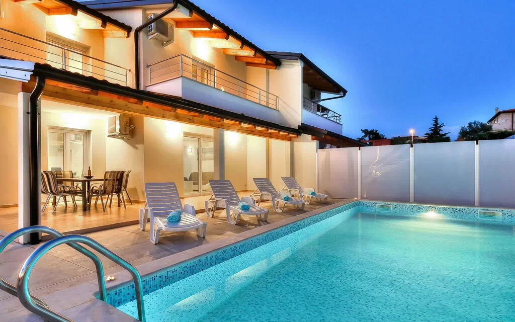 Plovanija 4 km from Buje: Beautiful semi-detached house "Villa Mare", 2 storeys. In a quiet, sunny position, 7 km from the sea. Private: property 600 m2 (fenced), swimming pool angular (8 x 4 m, depth 150 cm, 20.04.-12.10.). Outdoor shower, terrace (30 m2), garden furniture, barbecue. In the house: internet access, washing machine. Motor access to the house (100 m via unmade road). Parking (for 4 cars) at the house on the premises. Shop 500 m, restaurant 150 m, pebble beach 7 km, rocky beach 7 km. Golf course 10 km, walking paths from the house 100 m, cycle lane 150 m. Please note: airfield 10 km from the property.