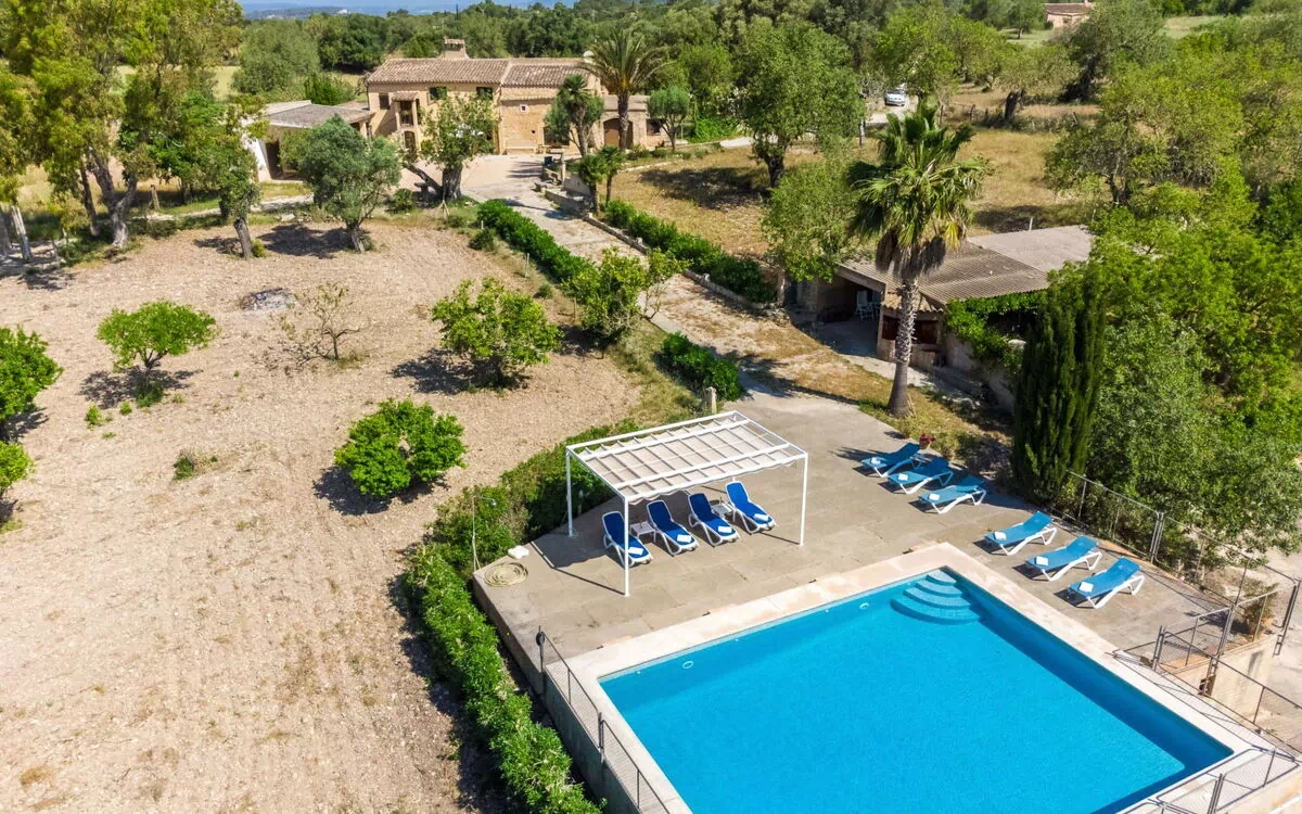 Camí Can Amagat 5 km fra Felanitx: Moderne, rustikt landsted "Can Amagat", omgivet af marker. 4 km fra bymidten af Felanitx, 16 km fra centrum af Campos, 54 km fra bymidten af Palma, rolig, solrige beliggenhed, 2 km fra skovbryn, 17 km fra havet, 16 km fra stranden, i det grønne. Til alene benyttelse: grund 80'000 m2, stor have med planter og træer, pool kantet (9 x 7 m, 200 cm dyb, Sæsonbestemt tilgængelighed: 01.Jan. - 31.Dec.). Udendørs brus, poolhus med køleskab, terrasse, lysthus, pergola, havemøbler, grill, Underholdning af poolen af ejeren/gartneren. I huset: cykelrum. 700 m lang, tilkørsel til til grundstykket (natursti). Parkeringsplads ved huset på grunden. Indkøbsforretning 4 km, fødevarebutik 5 km, supermarked 6 km, indkøbscenter 12 km, restaurant 8 km, bar 5 km, bageri 5 km, café 5 km, busstoppested "Felanitx" 6 km, banegård "Manacor" 12 km, sandstrand "Cala Murada" 19 km, stenstrand "Cala Varques" 11 km. Lystbådhavn 15 km, marina 15 km, golfbane (18 hul) 3 km, surfskole 14 km, sejladsskole 14 km, tennis 12 km, ridehal 18 km, sportcentrum 15 km, vandrestier fra huset 10 km, cykelvej 12 km. Nærliggende attraktioner: Museo Junipero Serra 7 km, Ermita Bonany 10 km, Porto Cristo 6 km, Safari Park Sa Coma 8 km, Castell de Capdepera 15 km. Vandrestier Finca Son Real 18 km, Parque natural Llevant 12 km. Bemærk venligst: bil anbefales. Ejeren accepterer ikke nogen ungdomsgrupper. Dyr i området. Flyveplads 48 km fra huset.