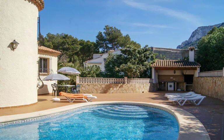 Hus "Efaistos". I bydelen La Pedrera, 4 km fra bymidten af Denia, 100 km fra centrum af Alicante, 100 km fra bymidten af Valencia, i en bydel, 4 km fra havet. Til alene benyttelse: grund 800 m2 (indhegnet) med planter og træer, pool nyreformet (8 x 4 m, Sæsonbestemt tilgængelighed: 01.Jan. - 31.Dec.). Udendørs brus, parkeringsplads på grunden. Indkøbsforretning 3 km, restaurant 3 km, sandstrand 4 km. Golfbane (18 hul) 7 km.