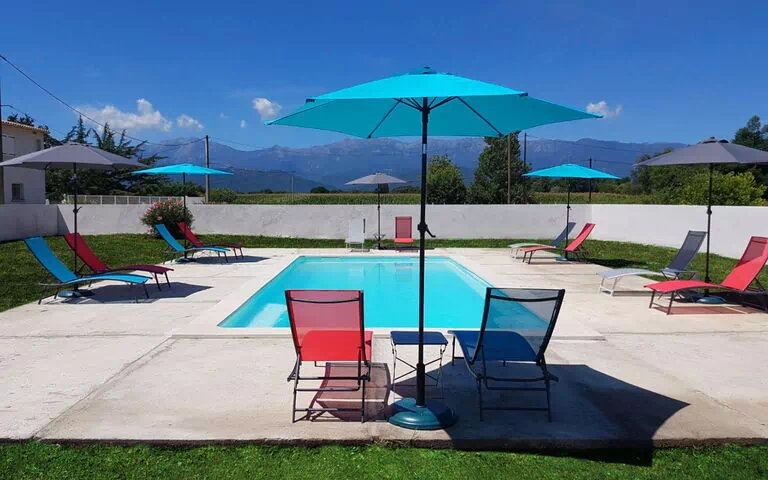 Beautiful single-family house "Dracena", surrounded by fields. 3 houses in the residence. 3 km from the centre of Ghisonaccia, 60 km from the centre of Porto Vecchio, outside the resort, 90 km from the centre of Bastia, 3 km from the beach, in the countryside. For shared use: garden with plants and trees, meadow, swimming pool (9 x 4 m, seasonal availability: 02.Apr.-29.Oct.). Parking on the premises. Supermarket 700 m, sandy beach "Ghisonaccia" 3 km. Please note: car recommended. The owner lives on the same property.