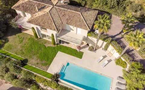 Moderne villa "Lei Suve". 10 km fra bymidten af Grimaud, 4.5 km fra centrum af Sainte Maxime, 12 km fra bymidten af Saint Tropez, boligområde, 1.4 km fra havet. Til alene benyttelse: grund 1'550 m2 (indhegnet), velplejet have i forskellige niveauer, pool (12 x 5 m, Sæsonbestemt tilgængelighed: 01.Jan. - 31.Dec.) med alarmanlæg og salt-elektrolys. Udendørs brus, petanque. 30 m lang, stejl tilkørsel. Parkeringsplads (for 3 biler) på grunden. Indkøbsforretning 4.5 km, busstoppested 1.6 km, sandstrand "Beauvallon" 1.4 km. Golfbane (18 hul) 2 km.