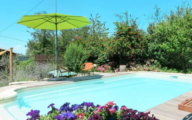Svømmepølen måler 8 x 4 meter med en dybde på 140 cm og er tilgængelig fra 1. maj til 3. oktober. En udendørs bruser befinder sig i nærheden af poolen. Terrassen er udstyret med havemøbler og skaber ideelle rammer for udendørs spisning og afslapning med udsigt over det omkringliggende landskab. Den terraskede have med velholdt græsplæne og et rigt udvalg af planter samt en naturlig have bidrager til ejendommens uberørte karakter. En plantet indre gård tilbyder et yderligere område med grønne omgivelser og ro. Ejendommens store område omkring bygningerne giver rigeligt plads til afslapning og udendørs aktiviteter.