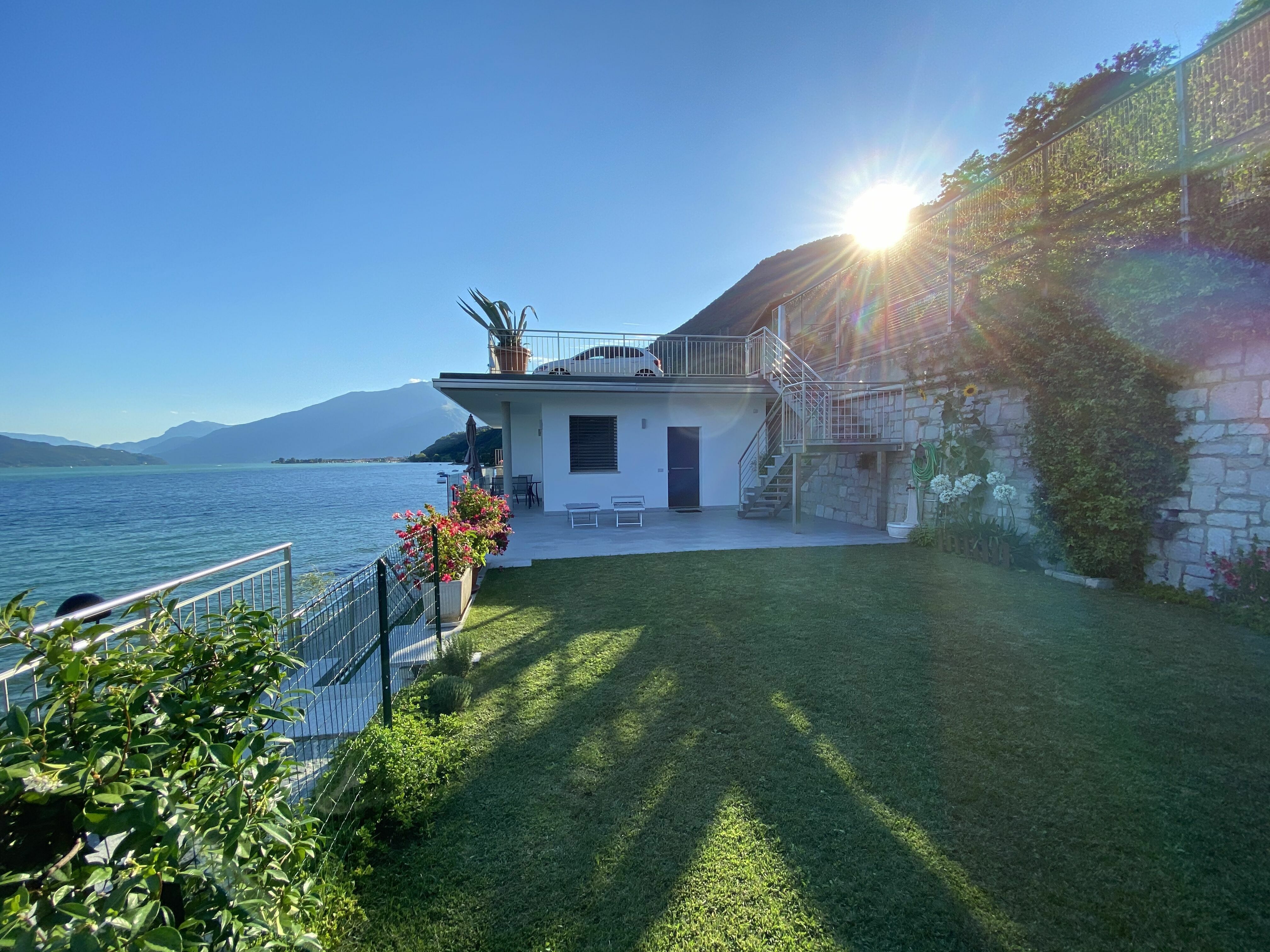 Det private, indhegnede område på 210 kvadratmeter omfatter en frodig græsplæne. Villaen ligger blot 5 meter fra søen, og strandlinjen med stenene strand ligger direkte foran ejendommen. En cykelsti ligger 5 meter væk, hvilket gør det nemt at udforske de maleriske stier langs søen. En trappe med 18 trin fører op til huset.