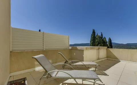 Smuk residens "Les Terrasses de Grimaud", på 4 etager. I bymidten fra Grimaud, høj beliggenhed ved bakke, 6 km fra havet. Indkøbsforretning 250 m, fødevarebutik 400 m, supermarked 6 km, restaurant 150 m, busstoppested "Grimaud village" 20 m, sandstrand "Port Grimaud" 6 km. Lystbådhavn 6 km, golfbane (18 hul) 9 km. Nærliggende attraktioner: Port Grimaud 6 km, Parc d'attractions Azur Park 6 km, Sainte Maxime 12 km, Saint Tropez 13 km, Cannes 85 km, Nice 110 km. Kendte søer nås nemt: Lac de Sainte Croix 95 km. Vandrestier Massif de l'Esterel 50 km. Bemærk venligst: bil anbefales, ingen elevator. Nøgleoverrækkelsen finder sted på kontoret Interhome Gassin, 8 km borte.