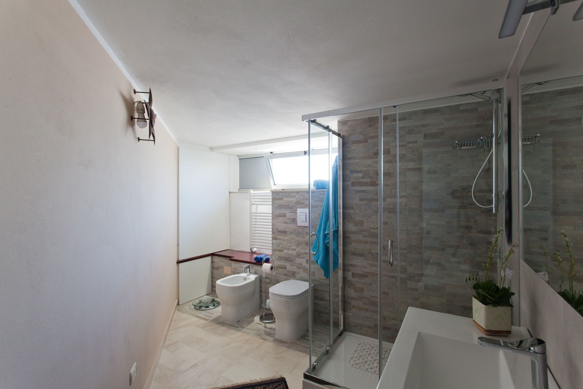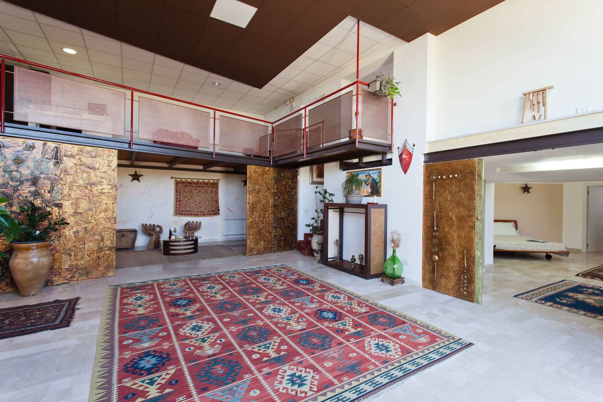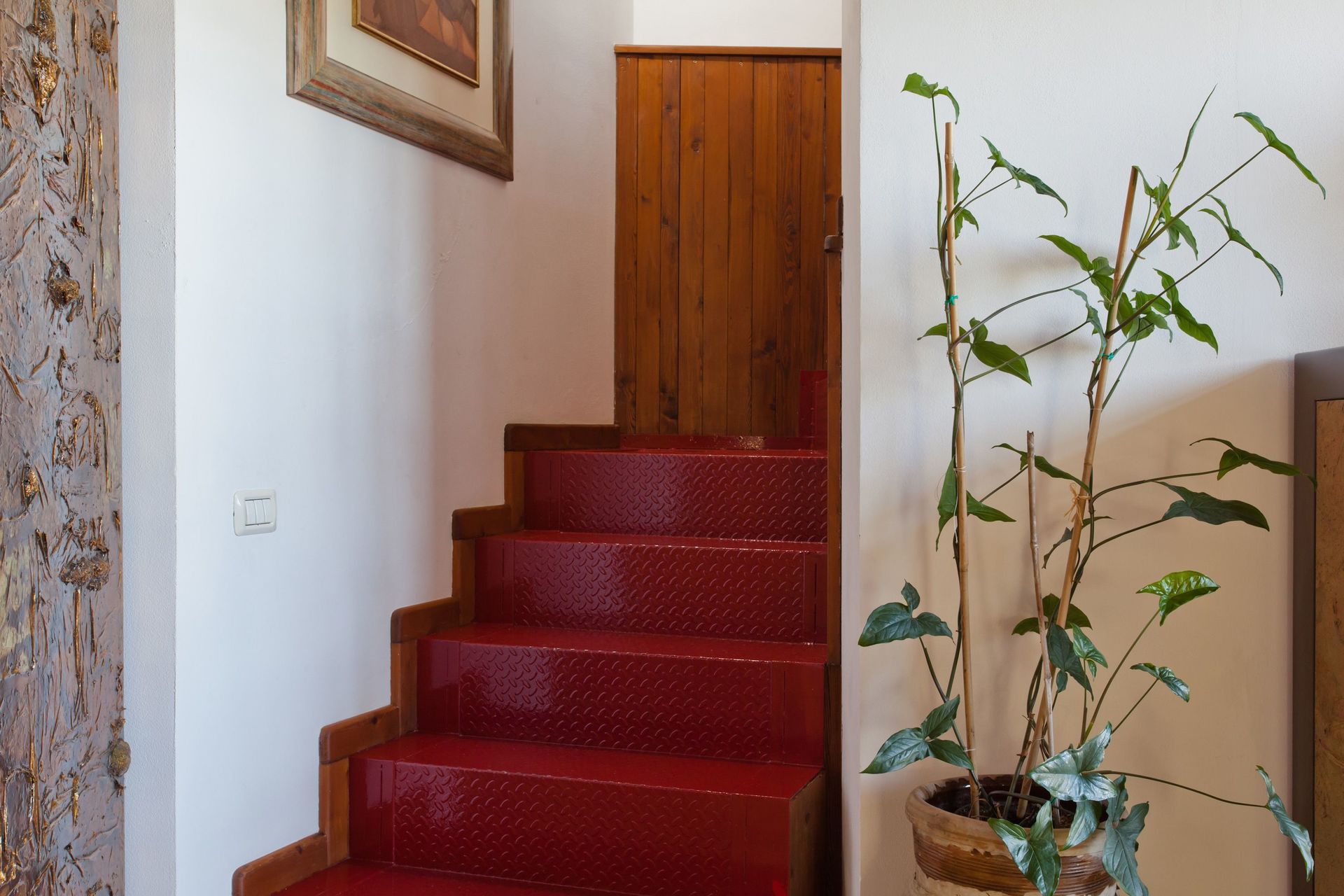 Hems / loft (åbner til området nedenfor og udstyret med 2 klimaanlæg): dobbeltseng og fransk seng adskilt med garderobeskabe, badeværelse med bruser.