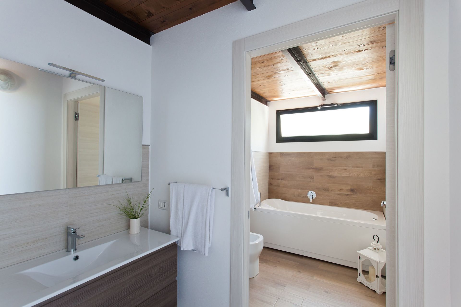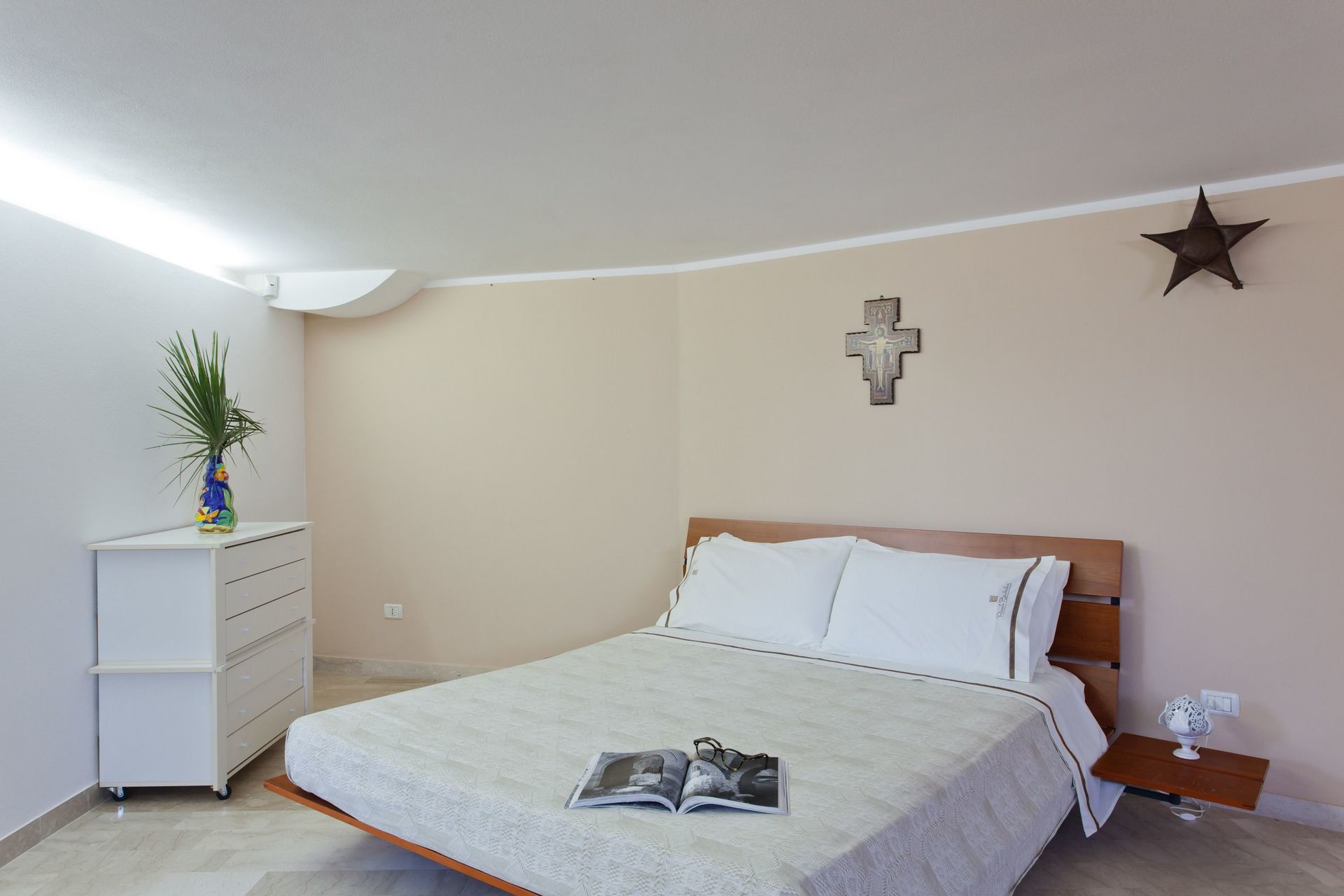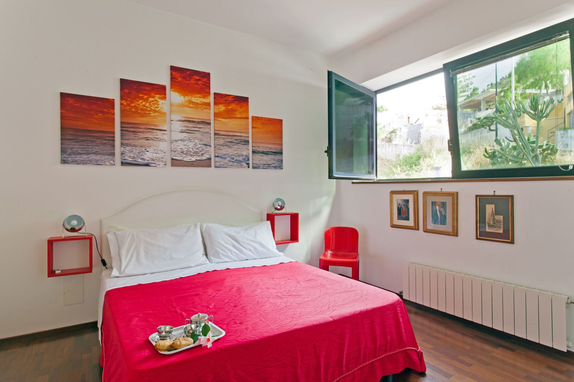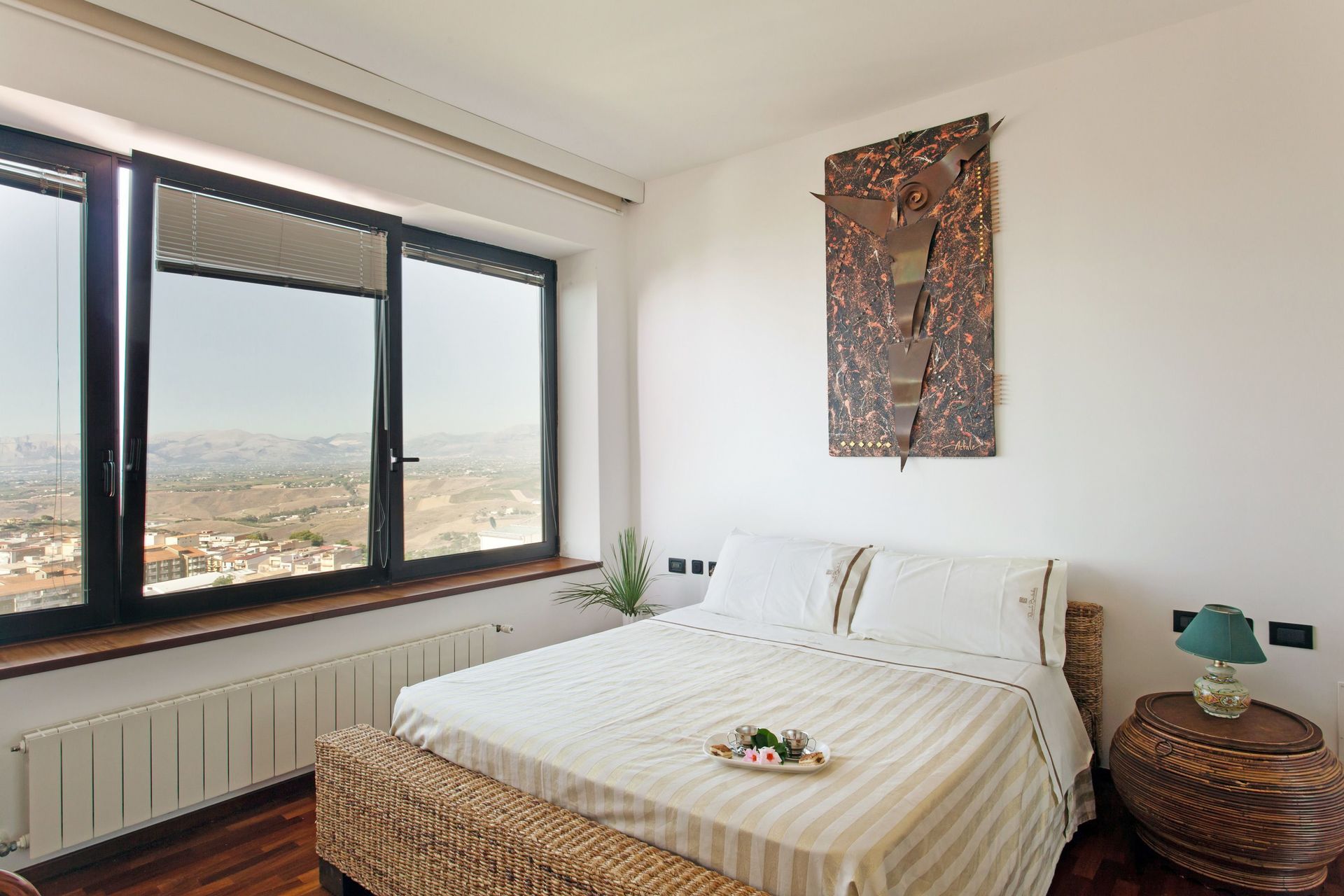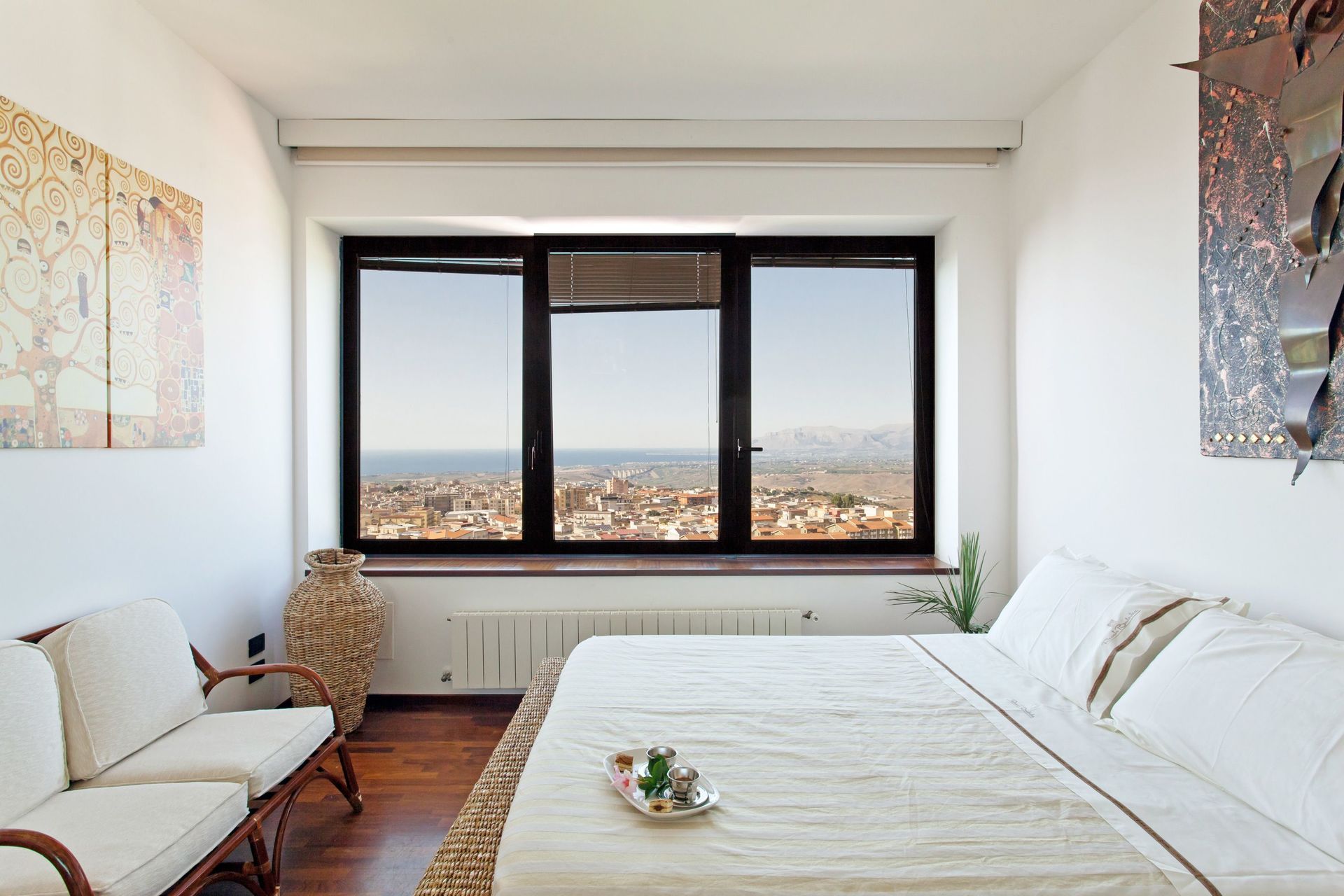 Stueetagen (udefra): indgang til spektakulære stue (aircondition) med store vinduer med udsigt over havet og byen Alcamo, køkken (fryser, opvaskemaskine, maskine ovn, vask) med spiseplads (air condition), soveværelse med dobbeltseng (klimaanlæg), soveværelse med enkeltseng (aircondition), badeværelse med boblebad, soveværelse med dobbeltseng (air condition), enkeltseng og eget badeværelse med bad / bruser, soveværelse med dobbeltseng (aircondition).