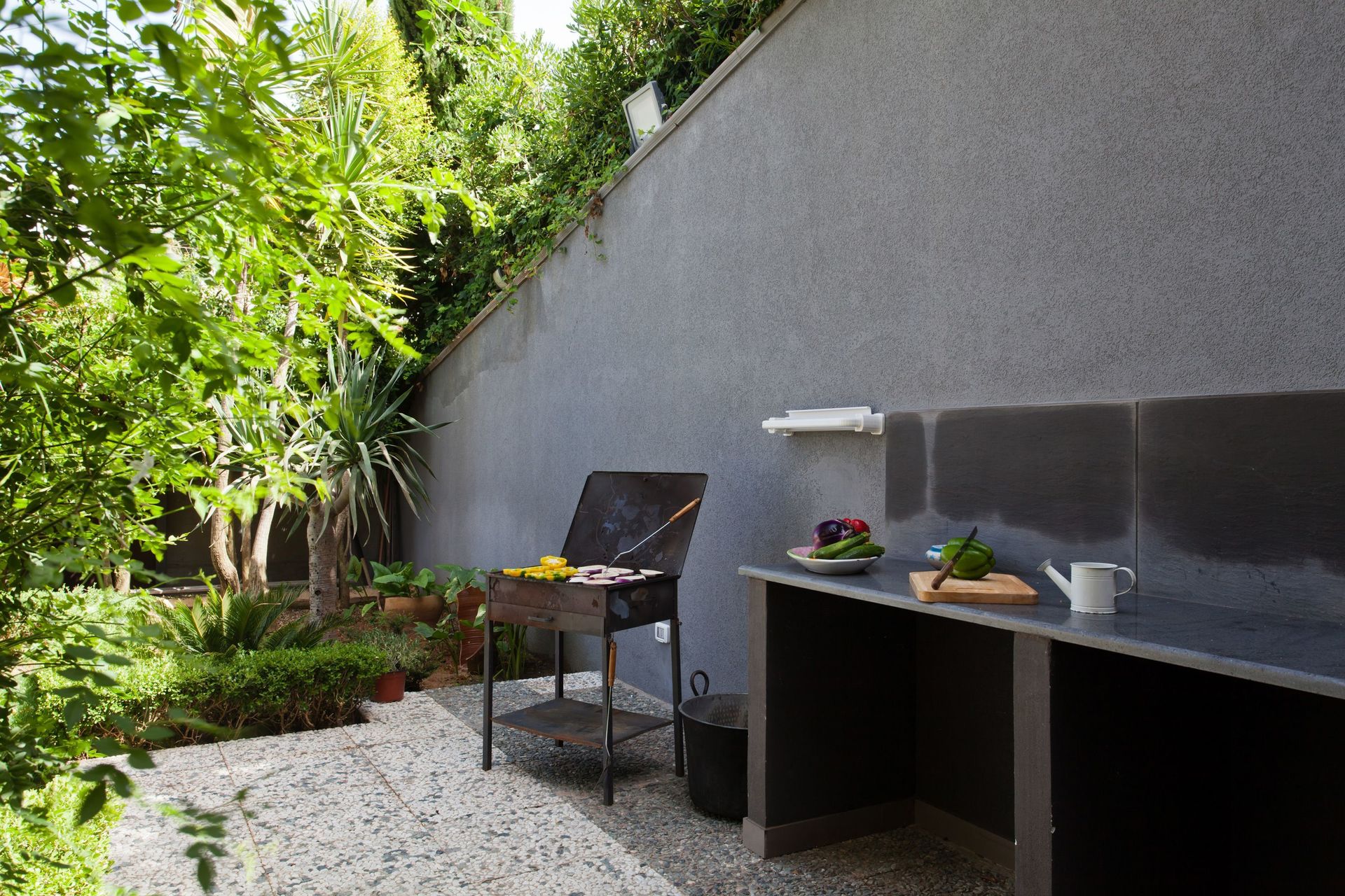 - Udendørs rum indrettet med grill, bord med stole, der kan bruges til udendørs spisning