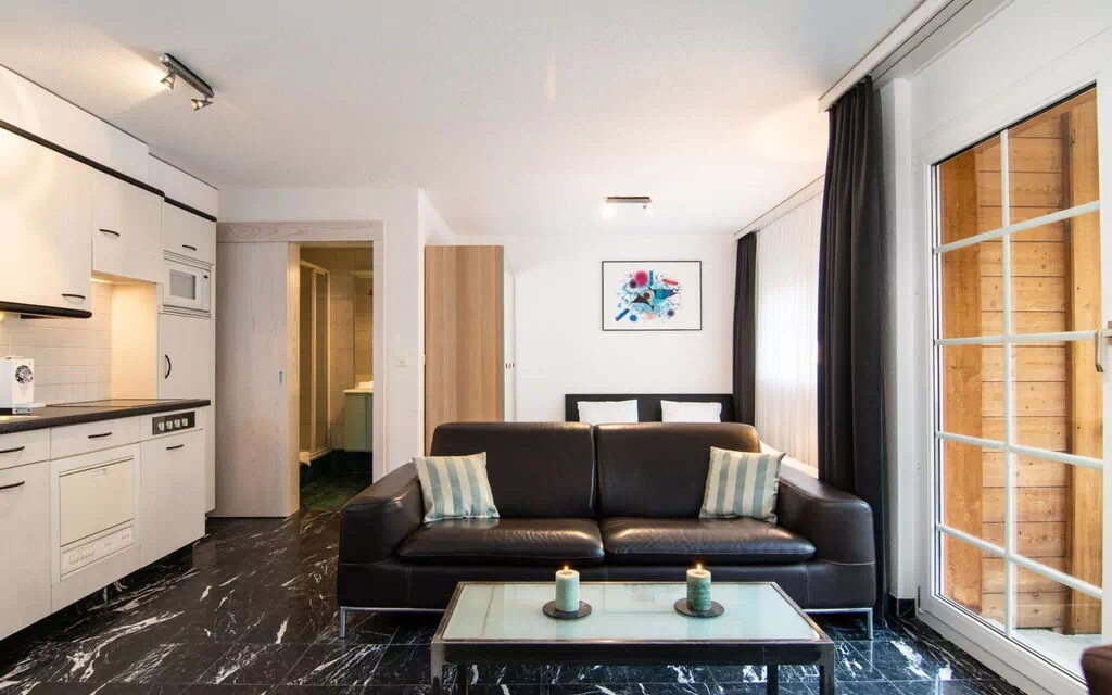 Directly located in the skiing and hiking area, the bright and modern apartment offers you a west-side balcony and a high-standard interior. With its 29 sqm, its queensize-bed and the bathroom with shower and WC it is the perfect single or couple apartment.  The sunny westside-balcony invites you to enjoy the stunny views. The kitchenette is equipped with coffeemachine, cooking facility, small oven, dishwasher, microwave and a combinated fridge/freezer. On top of that you will find a toaster and a fondue-set.  The living area contains a dining table, a sofa and a flatscreen-TV.  WIFI can be used of course for free.  The apartment is located on the 2. floor of the building and can be reached by elevator. In the basement you will find a private skiroom.