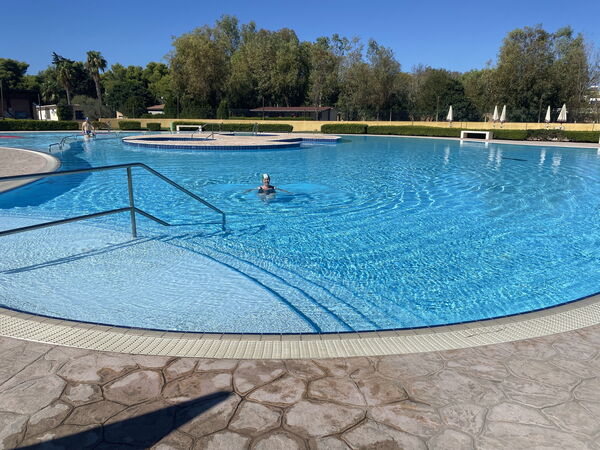 De 2 fælles svømmepøle er åbne fra 1. maj til 30. september og er udstyret med bruser- og WC-faciliteter placeret direkte ved poolområdet. Brug af badehætter er obligatorisk ved brug af poolene. Området tilbyder en dedikeret børnelekeplads, en terrasse egnet til udendørs afslapning og forskellige rekreative faciliteter til fælles brug, herunder bordtennisbord, boccia og strandvolleyball. Tennisbanen er tilgængelig mod merpris.