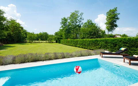 Svømmepølen måler 6 x 3 meter med en dybde på 130 centimeter og er tilgængelig fra 30. maj til 15. september. Gården på 1.000 kvadratmeter er fuldt indhegnet og udstyret med græsplæne samt en grillplads til udendørs spisning. Der er en gynge og en sandkasse til børnene.
