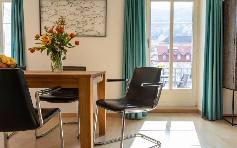 Stue/spisestue med sat-TV og spisebord. Rauchen nicht erlaubt. Internet (Trådlös LAN [WLAN]). 1 dobbel sofaseng.