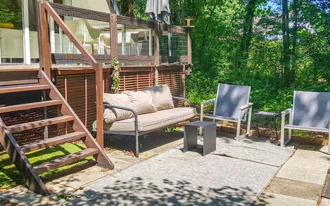 "Frui Cotidie", 3-værelse-hus 75 m2 på 2 etager. Skråt, komfortabelt indrettet: stue/spisestue med spisebord, fladskærms TV, cd og DVD. Udgang til altan, til terrasse. Åbent køkken (4 kogeplader, opvaskemaskine, mikroovn). Brus/WC. Opvarming. Overetage: (stejl trappe) 1 skrå dobbeltværelse med 2 senge (90 cm, længde 200 cm). 1 skrå dobbeltværelse med 1 dobbeltseng (1 x 160 cm, længde 200 cm). Altan terrasse. Havemøbler, altanmøbler. Udsigt over skoven. Til benyttelse: højstol, barneseng, hårtørrer. Internet (trådløs LAN [WLAN], gratis). Blu-ray spillere, iPod docking station. Parkeringsplads (2 Biler) ved huset. Bemærk venligst: ikke-ryger hus. Brandalarm.