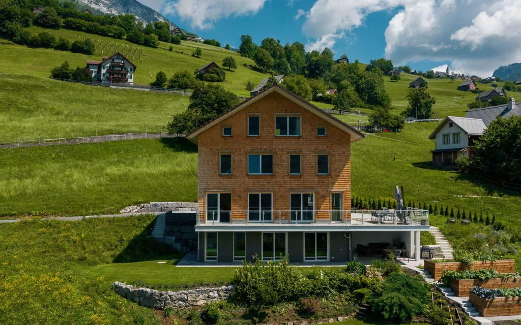High above the shores of Lake Walen, in a unique panoramic location between Weesen and Amden, lies the luxurious Chalet Lehni. The chalet consists of two apartments with separate entrances. The first apartment in the basement offers 4 beds. The second apartment, which extends from the first floor to the attic, has a total of 12 beds. The chalet has its own garden. From the terrace you can enjoy a beautiful view of Lake Walen and the mountains. The village center of Amden and the village of Weesen can be reached by car or from the bus stop at Lehni, which is in the immediate vicinity, in about 10 minutes. In the town center of Amden is the Mattstock chairlift, the feeder to one of Amden's ski resorts. In addition, there are, among other things, restaurants, a café with a bakery and an indoor swimming pool. The chalet is very modern and was newly built in 2020. A total of four parking spaces are available in front of the chalet. The vacation region Amden Weesen, with its unique combination of mountains and lake, offers numerous leisure activities. The hiking trails with different levels of difficulty and great viewpoints invite you to hike in winter as well as in summer. In the winter it has popular ski resorts for families in Amden and Arvenbüel. The Swiss Ski School in Arvenbüel offers group and private lessons for all ages. The beautiful winter landscapes are perfect for snowshoeing. Amden is also an ideal starting point to discover the cities of Zurich, St, Gallen, Chur or the vacation region Rapperswil Zürichsee with the Rose City of Rapperswil. Our tip: A hike to Betlis starts directly from your chalet. Past the reservoir with its impressive dam wall, the trail descends through the forest to Betlis.