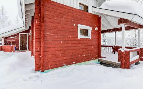 3,3 km / 2,05 mi from Paljakka ski centre. Distance to Lake Rakennusjärvi 3 km / 1.86 mi (1 km / 0.62 mi long and 200 m / 219 yds wide). Semi-detached chalet of massive logs, built in 1994. Bedroom with double bed, kitchenette and living room, sauna with adjoining dressing room, WC, loft with 2 beds and another loft with 3 mattresses. Steep stairs to the lofts.