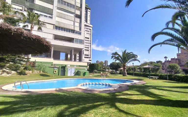Playa de Poniente: Cosy, comfortable apartment block "MIRANDA II", 24 storeys. 750 m from the centre of Benidorm, in a quiet, sunny position, 240 m from the sea, 240 m from the beach, east facing position. For shared use: property (fenced), terraced garden with lawn, swimming pool kidney-shaped (5 x 10 m, depth 45 - 165 cm, seasonal availability: 01.Jan.-31.Dec.). Children's pool, tennis, children's playground (slide, swing). In the house: lift. Parking on the premises. Grocery, supermarket 200 m, shopping centre 2 km, restaurant, bar, café 200 m, bus stop "Benidorm Ciudad" 200 m, railway station "Benidorm- Alicante" 2.5 km, sandy beach 300 m. Golf course (18 hole) 5.8 km, walking paths from the house 500 m. Nearby attractions: Aqualandia 5 km, Mundomar 5 km, Terra Mitica 5 km, Mundomar 5 km, Alicante 39 km, Aeropuerto Alicante4 52 km. Groups of teenagers on request only. Neighbourhood highly sensitive to noise. Quietness and good behaviour expected.