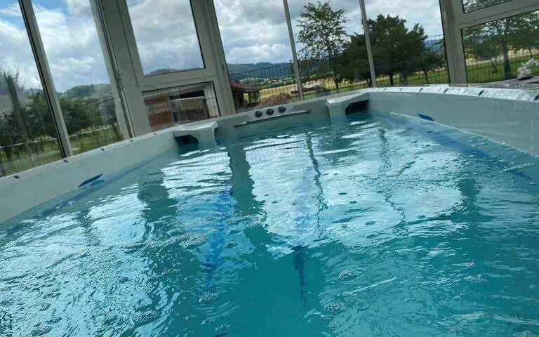 Villa Spa de l'Ajoie... joy in the Jura Discover the charming Villa Spa de l'Ajoie! Nestled in the green countryside of the Swiss Jura in a friendly neighbourhood, Villa Spa de l'Ajoie offers you plenty of space and a rejuvenating view of the Jura landscape and its horses. The villa is equipped with a large American swimming spa (hydro massage bath area, counter-current swimming machine, water gym equipment, light shows, fountains, water temperature between 33 and 35 degrees depending on the season). This aquatic area is located in a large veranda which offers you the possibility to enjoy the Spa at any time and in any season while enjoying a beautiful view. The villa also has a nicely equipped terrace (with garden furniture and an electric barbecue) complete with a bio-climatic pergola enabling you to enjoy pleasant temperatures naturally. Children can also have fun outside with various games. The ground floor consists of a living room with an open-plan kitchen (including crockery), a suite with a double bed and a bathroom with a bathtub, a bedroom with two single beds (one of which is a pull-out bed), a bedroom fully adapted for babies, and another bathroom with shower. On the first floor, you will find a room that also affords a pleasant view and is organised with an area featuring a second TV lounge, a sports area and a games area. Two other bedrooms with double beds are located on the first floor and have a large shared bathroom with bath and shower. The villa is ideal for a cosy, warm and relaxing stay, as a couple, with family or friends, and to discover the beauty of the Jura. Seminars or meetings can also be organised here thanks to the space offered by the large room, and organisational support can be provided if required. Two bicycles are at your disposal and you can quickly access the cycle paths in the middle of nature. Located close to the motorway exit, the Villa Spa de l'Ajoie is easily accessible (between 45 and 60 minutes from: Basel, Biel and Mulhouse, Belfort, Montbéliard). Very suitable for: - families with children and babies, - bicycles. Villa Spa de l'Ajoie...joy in the Jura ! Our family: Andrijana is a coach and human resources specialist whose tribe consists of happy little Nina aged 2, adorable Nikola aged 6 and Dejan who is already a big boy.?? Human closeness, a sense of hospitality, sharing and development, as well as a taste for discovery are the key attributes shared by these hosts who have poured their hearts into their villa which they are delighted to share with guests. With the Jura-Pass, make the most of free public transport and get reductions on a range of activities in the region.