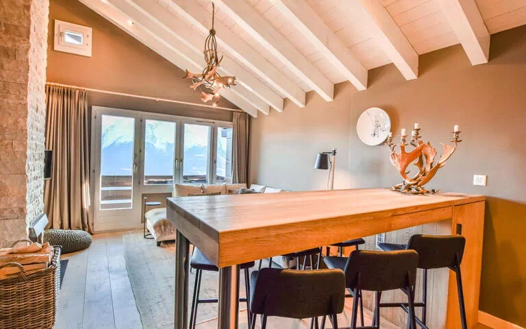 The attic apartment has its entrance on the northside of the building. Next to the entrance you will find a bootwarmer for ski- and snowboardboots. Upon entering the apartment, you will find the cozy living area, which is tastefully designed and offers practically all common means to spend your holiday in comfort. The dining area has a full equipped kitchen and dining bar. The lounge offers access to the sunny balcony. The lounge is equipped with a smart TV, a L-shaped couch with a tremendous view over the Southern Alps. Enjoy some après-ski relaxation in front of the fireplace. The apartment has two bedrooms, of which one main bedroom with double bed and television. From the main bedroom you can access the balcony. The second bedroom has a 'floating' bed. Under the bed, there is a couch. The room also offers an entertainment system. This room is a favourite amongst children. The bathroom has a walk-in shower, water basin and toilet.