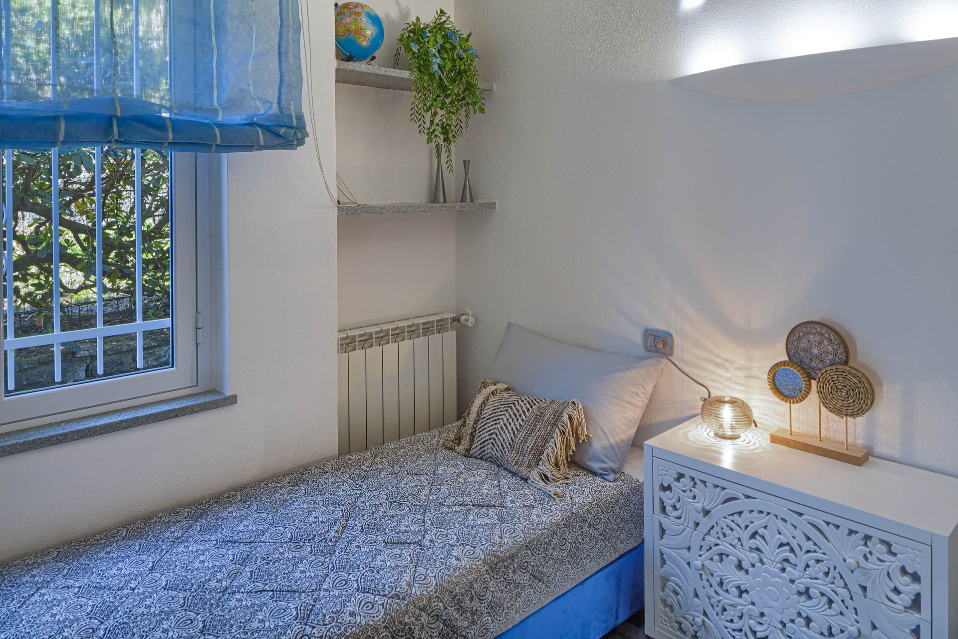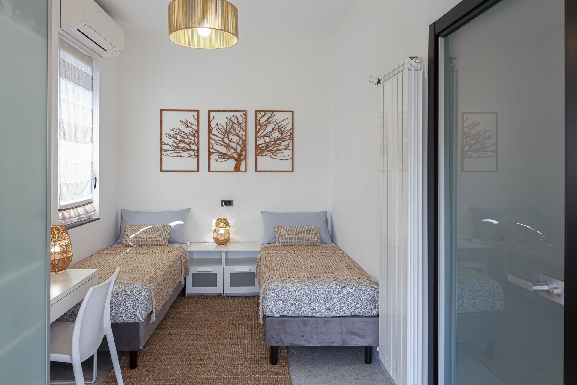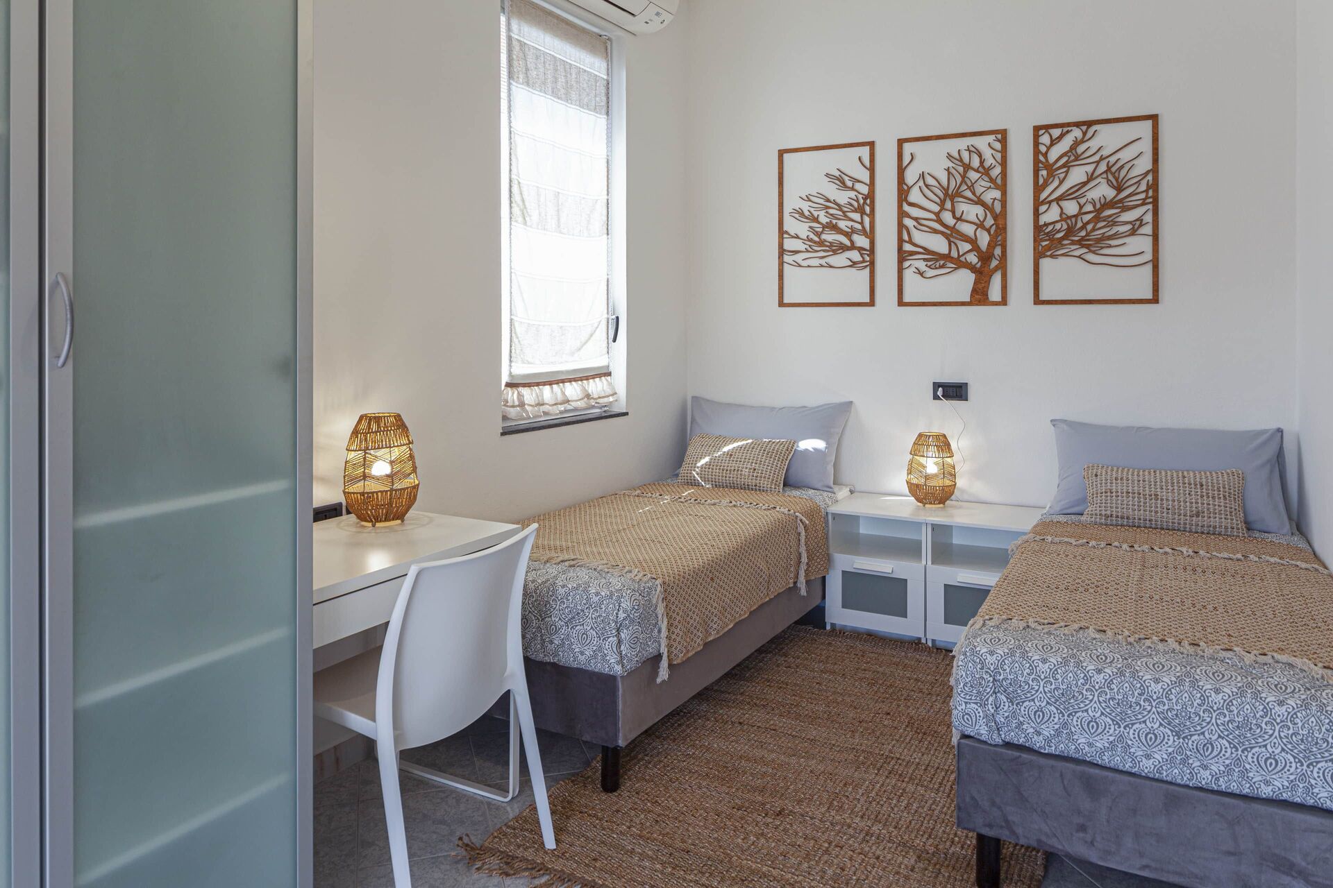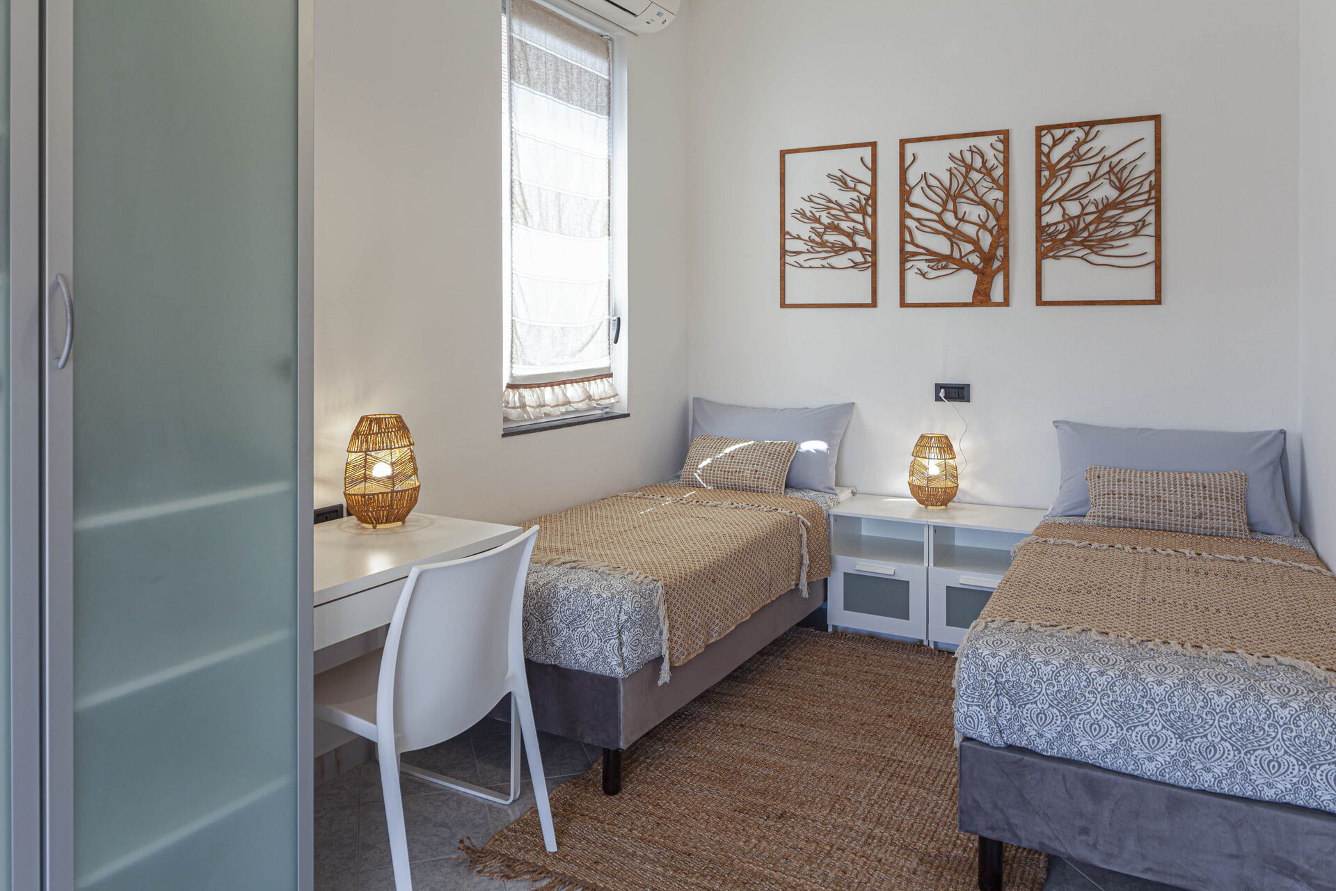 - 1 soveværelse med to enkeltsenge (der kan sættes sammen til en dobbeltseng). Dette værelse har udgang til altan.