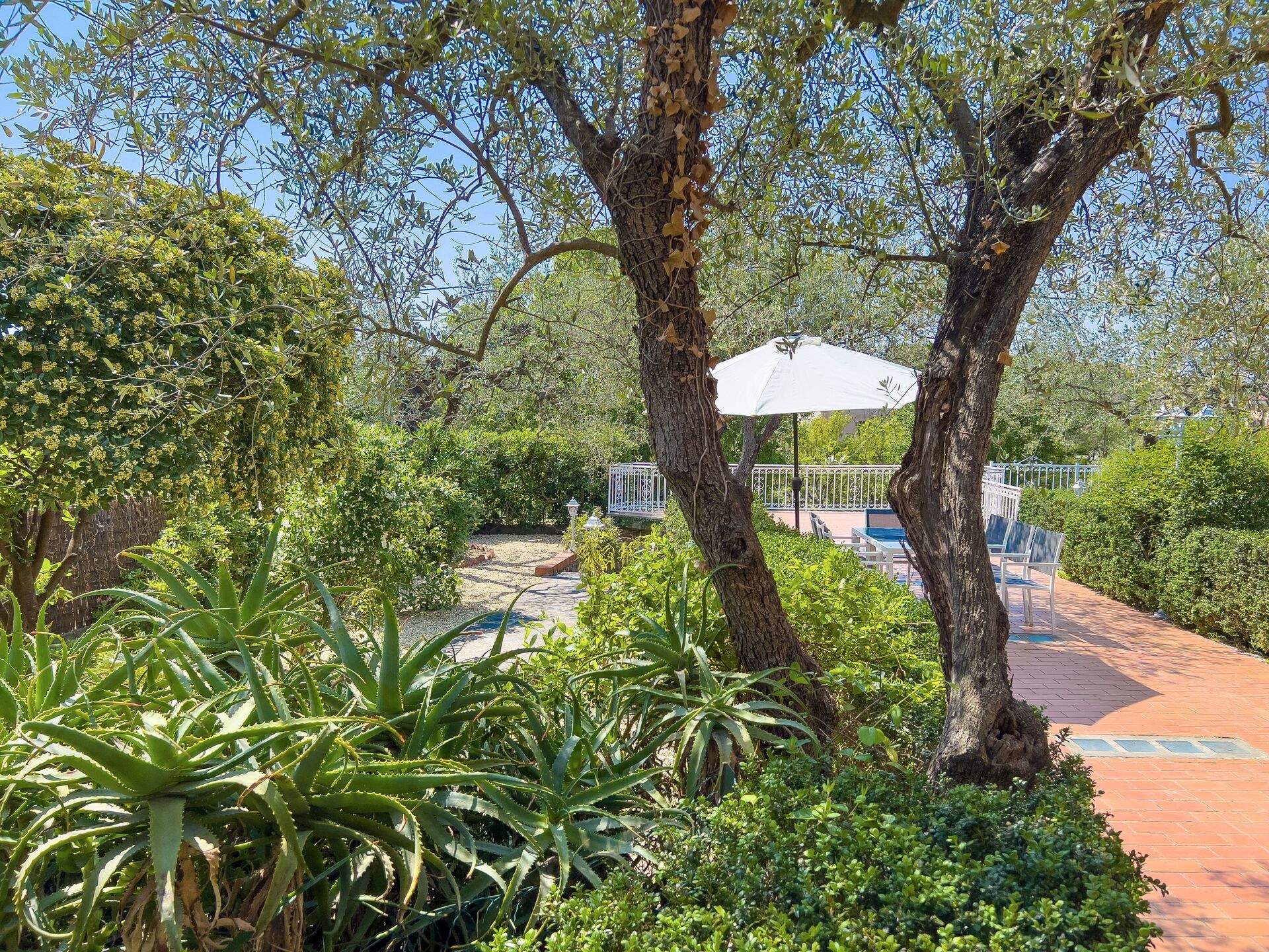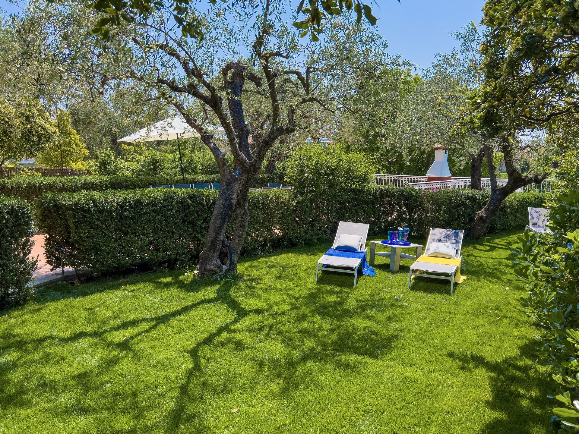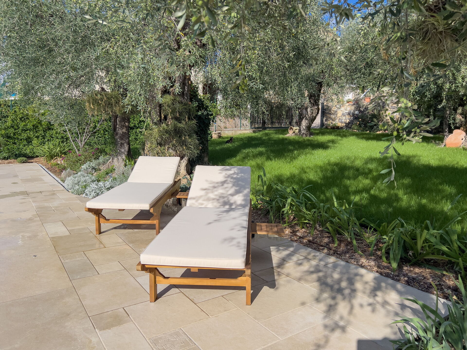 Udendørsområdet er perfekt til at slappe af og nyde en aperitif på liggestolene blandt oliventræerne og på lænestolene.