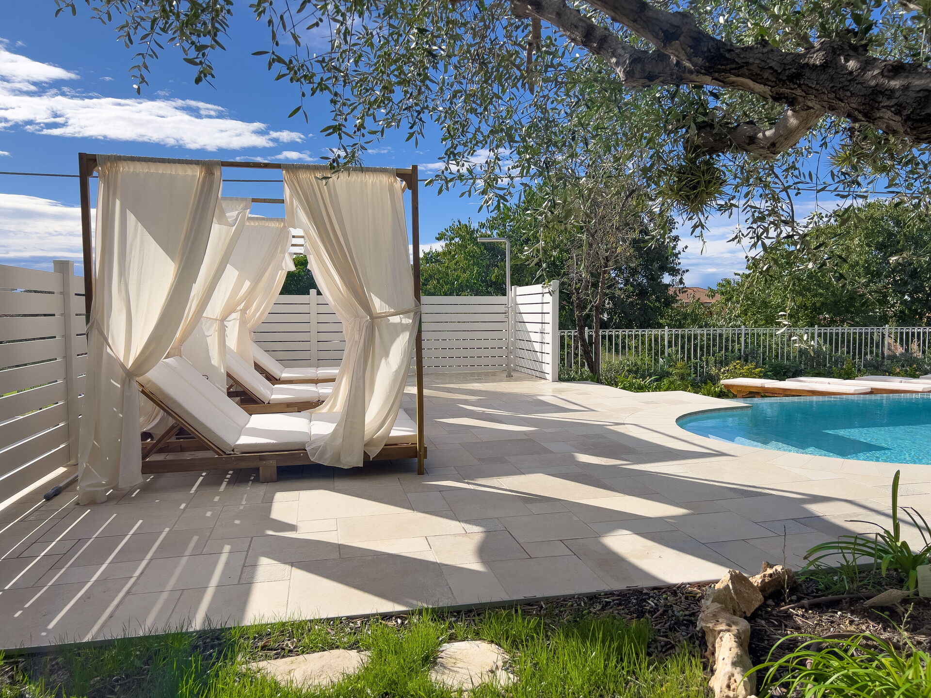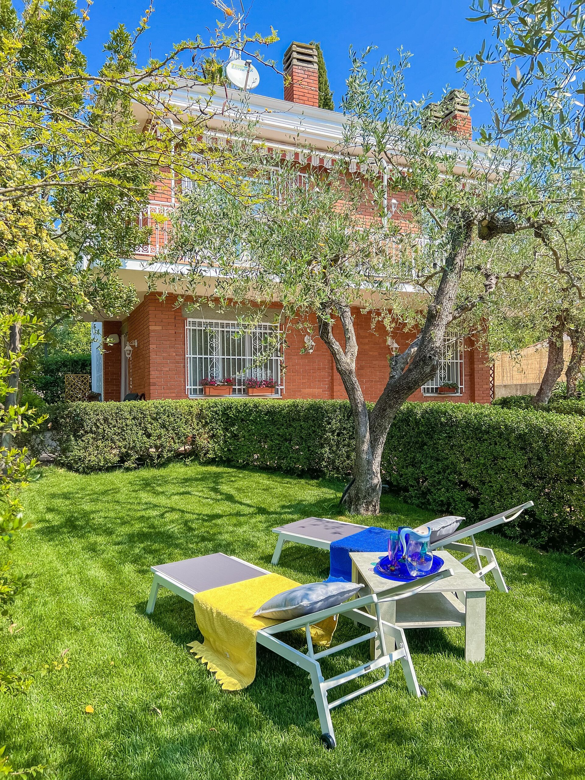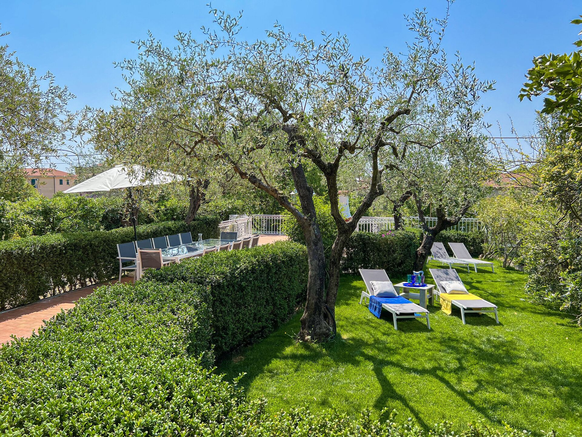 Udendørsområdet er perfekt til at slappe af og nyde en aperitif på liggestolene blandt oliventræerne og på lænestolene.