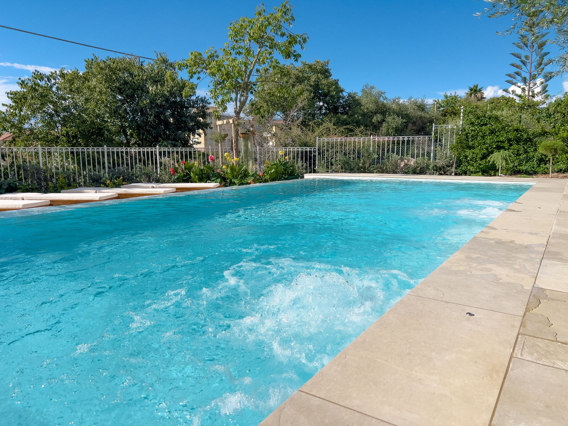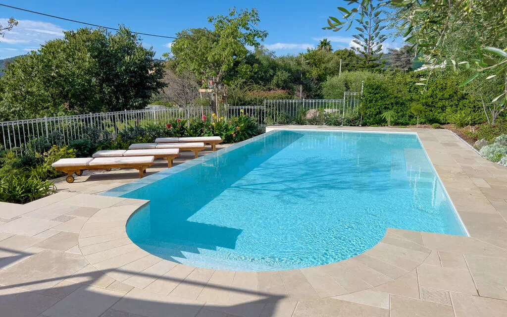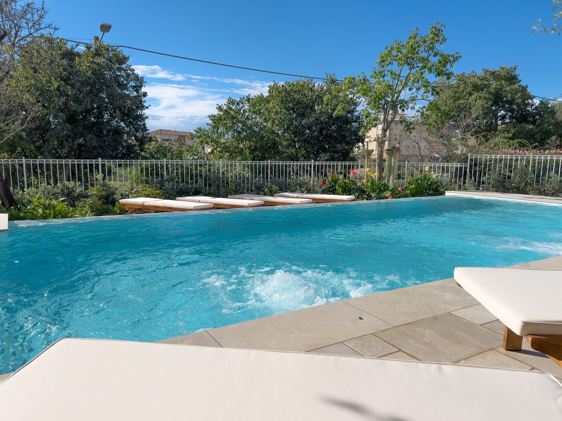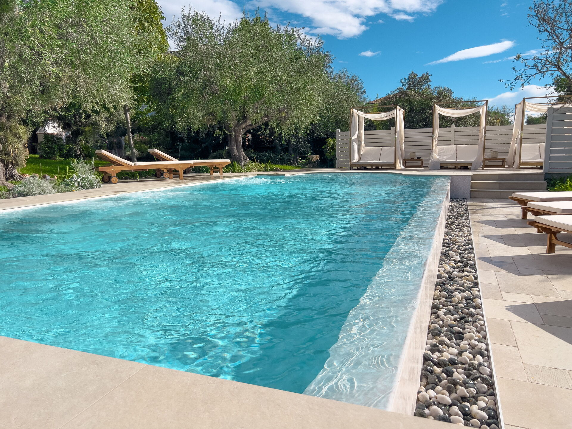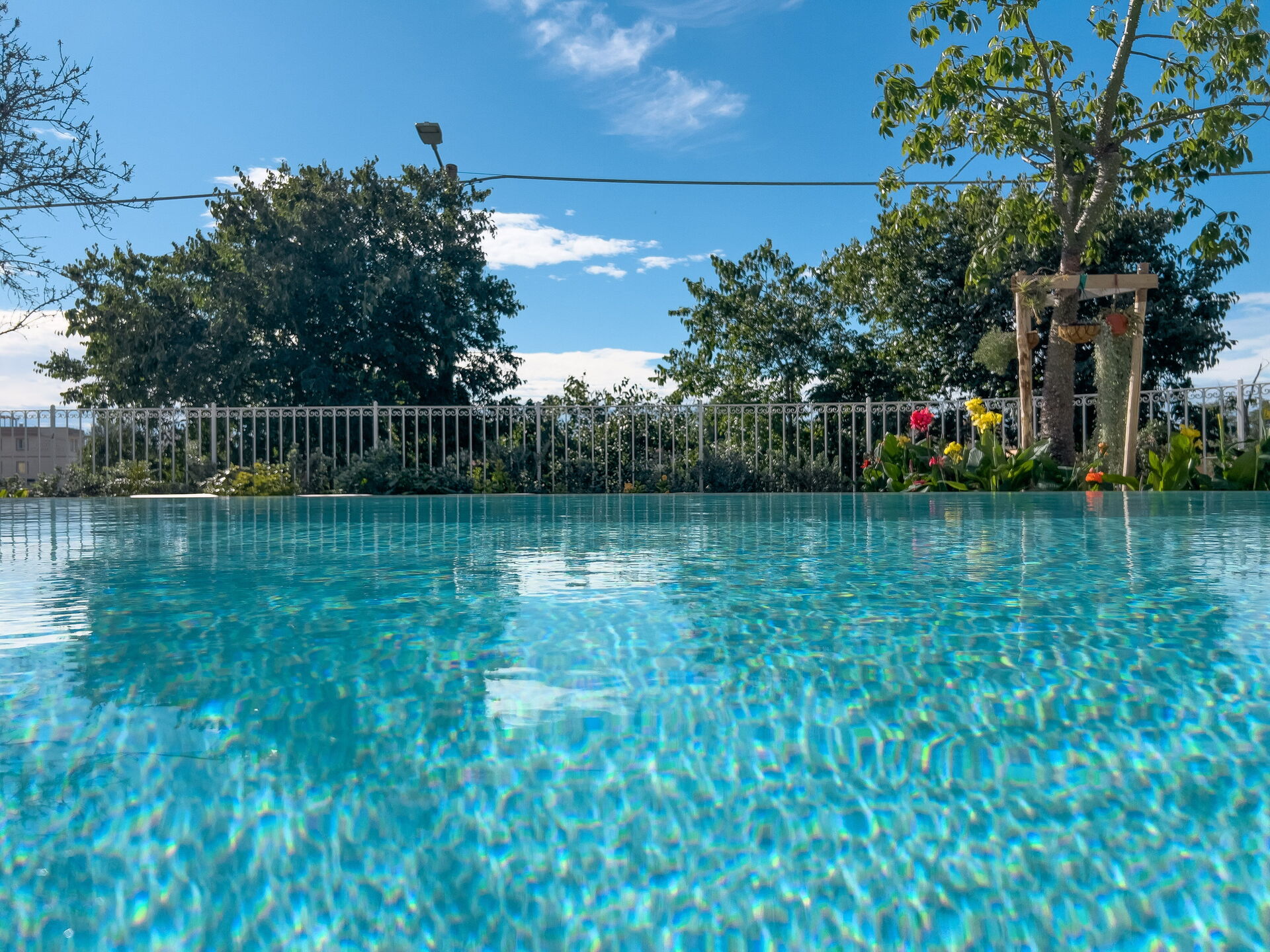 • en swimmingpool, der måler 10 x 5 meter, 135 centimeter dyb. En romersk trappe giver adgang til poolen, mens infinity-vandfaldet på sydsiden garanterer rent vand.