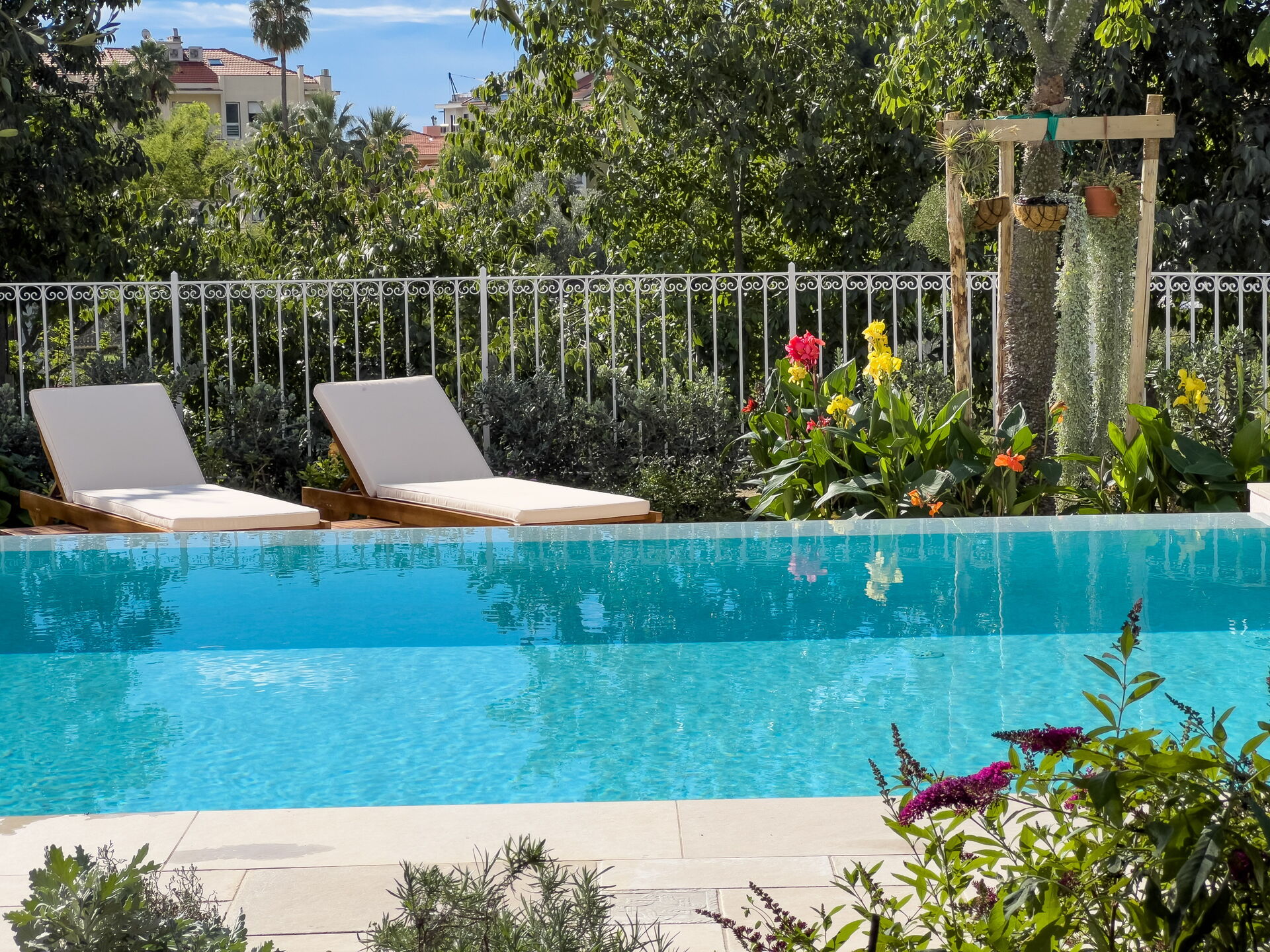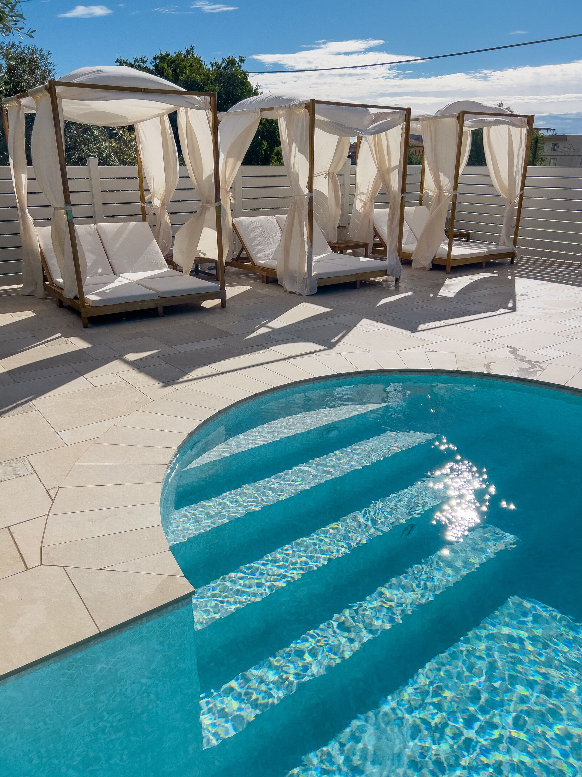 • et stort solarium, udstyret med koldt- og varmtvandsbruser (i køligere perioder), liggende himmelsenge, borde og liggende liggestole med små borde. Planter og blomster omgiver poolområdet.