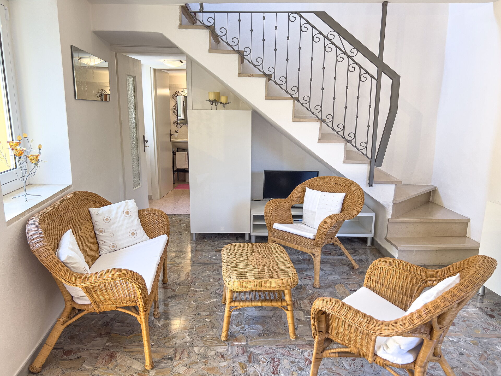 - stue, med 2 lænestole og en sofa, satellit-tv. Fra stuen er der udgang til en terrasse med bord, stole og parasol.