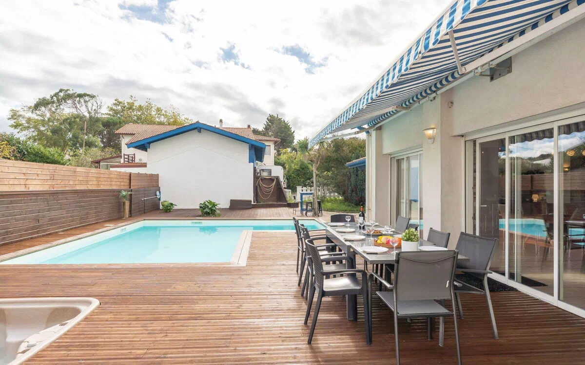 Bidart: Stor villa "Villa Suerte", på 3 etager. I bydelen Maribel, rolig beliggenhed, fra havet, 650 m fra stranden, i en blind vej. Til alene benyttelse: pool med varme (8 x 6 m, 180 cm dyb, Sæsonbestemt tilgængelighed: 01.Jun. - 31.Dec.). Udendørs brus, boblebad, bordtennis, grill. I huset: fitnessrum. Indkøbsforretning 600 m, fødevarebutik 1.3 km, supermarked 5 km, indkøbscenter 5 km, restaurant 600 m, bar, bageri 1.3 km, café, busstoppested "Uhabia" 550 m, banegård "Biarritz" 7 km, sandstrand "Uhabia" 650 m, varmtvandsbad "Helianthal" 7 km. Lystbådhavn 2.4 km, golfbane (18 hul) 9 km, surfskole 650 m. Nærliggende attraktioner: Bidaparc 1.5 km, Musée Saraleguinea 2.7 km, Citée de l'Océan 5.4 km, Pointe de Sainte Barbe 8.4 km. Vandrestier la Rhune.