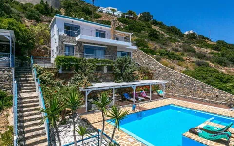 Elounda 67 km fra Heraklion: Meget moderne, meget luksuriøse villa "Elounda Senses", på 2 etager, fritstående, omgivet af træer. Ved bykanten, 3.5 km fra centrum af Elounda, rolig, solrige, høj beliggenhed på en bakke, område med lidt traffik, 500 m fra havet, 1.1 km fra stranden. Til alene benyttelse: grund 2'000 m2 (indhegnet), velplejet have med blomster og træer, pool kantet (8 x 5 m, 150 cm dyb, Sæsonbestemt tilgængelighed: 01.Apr. - 31.Okt.) med indetrappe. Skift af linned 2 gang ugentlig. Udskiftning af håndklæder 2 gang ugentlig. Rengøring af lejlighed 2 gang ugentlig. Parkeringsplads ved huset. Indkøbsforretning 3.6 km, fødevarebutik 3.6 km, supermarked 3.6 km, restaurant 1.4 km, bar 2.5 km, café 2.5 km, sandstrand "Hiona" 3.1 km kiselstenstrand "Elounda Breeze Beach" 1.1 km. Golfbane (18 hul) 47 km, tennis 8 km. Nærliggende attraktioner: Spinalonga Island 8.5 km. Kendte søer nås nemt: Voulismeni 6.7 km. Vandrestier Havgas Gorge 13 km. Bemærk venligst: bil anbefales. Velegnet for familier, babyudstyr på forespørgsel (inkl.). Unge grupper kun på forespørgsel. På forespørgsel: flygpladstransport til ferie-området.