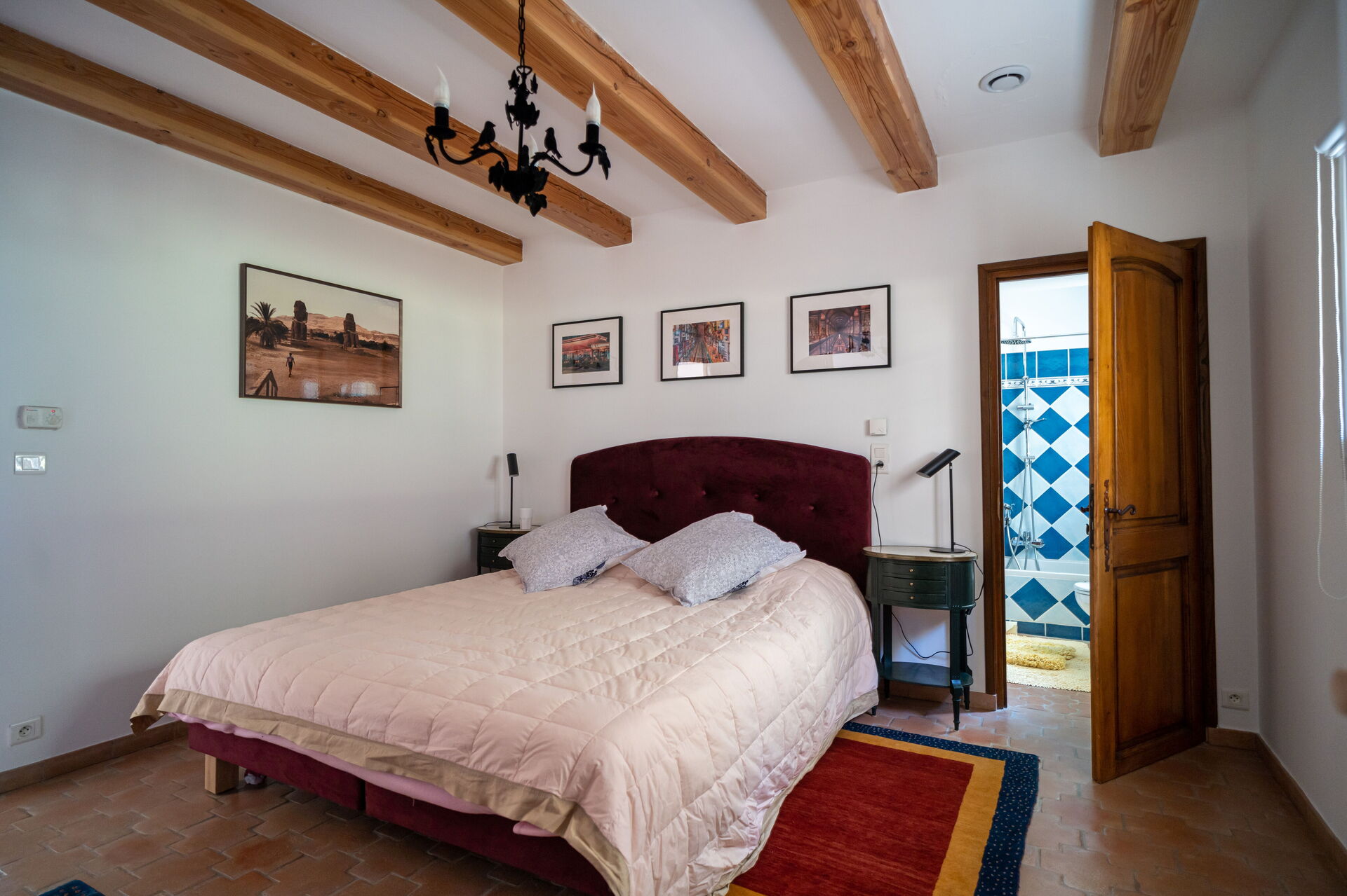 Soveværelse med bad: king size seng (bredde: 1.6m, længde: 2m), WIFI internet, internet, loftsventilator, mobil ventilator, køleskab, vask, wc, bruser, strygejern, udgang til have, udgang til terrasse.