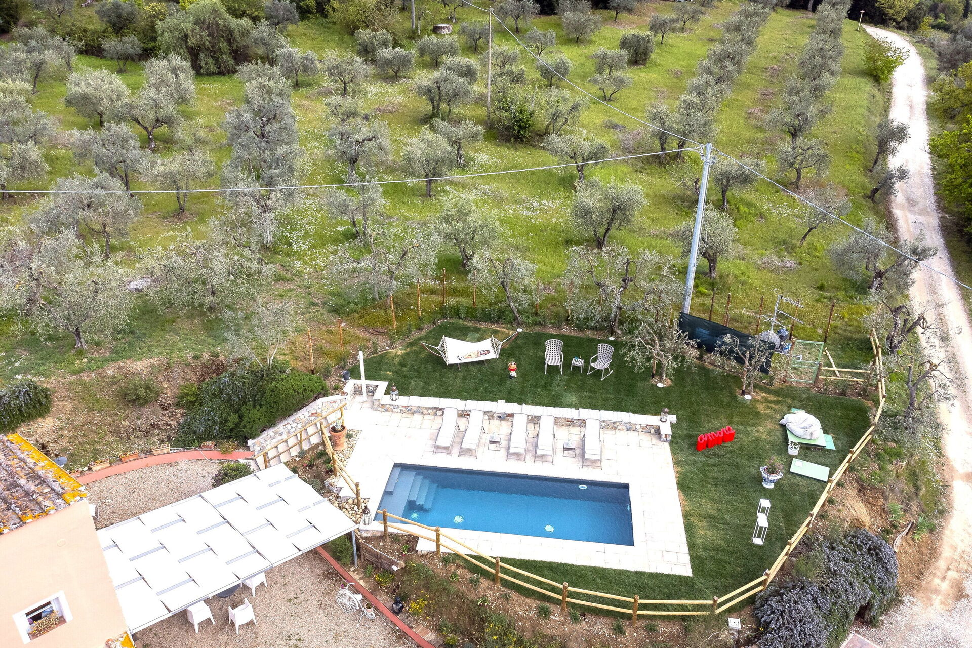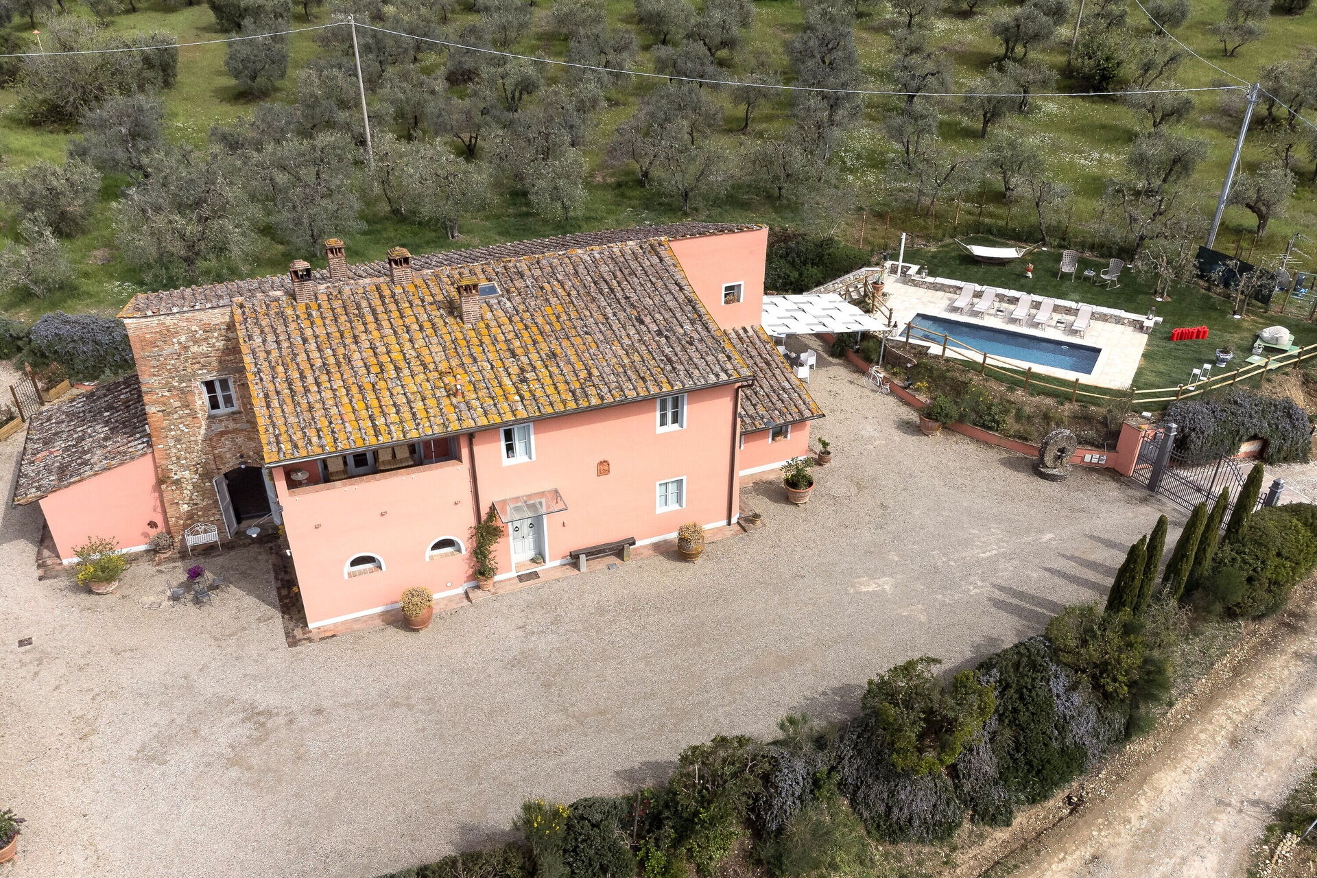 Ved ankomst vil I møde en dejlig ren velholdt ejendom med udsigt over bakkerne ideel til afslappende ferie i Toscana. Til jeres store nydelse vil I finde en privat pool, hvor I kan slappe af, mens I nyder en dejlig kold drik efter en hektisk dag med museumsbesøg. Udenfor vil I også finde jacuzzi, gårdhave og grill. Der er et køkken inkluderet kaffemaskine, mikroovn, brødrister og køleskab, samt, , samt masser af service og bestik til op til 11 personer. Hvis I foretrækker at spise 'al fresco', er der en fuldt møbleret gårdhave, hvor I kan nyde vejret, mens I spiser udendørs.