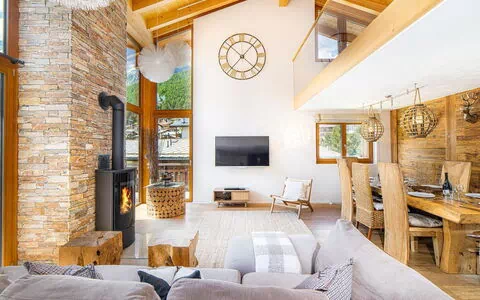 Sonneg Chalet Penthouse is a stunning four /five bedroom duplex apartment (250 sq metres) with a large open plan double height reception room. Fitted out to the highest standards it is perhaps the best of its type to be found anywhere in Saas-Fee! Sonneg Penthouse features: • Four/Five bedrooms sleeping up to 8-10 persons • Four ( en-suite) bathrooms plus entrance hallway toile. Fiths bedroom is adjacient to another bedroom and is equipped with a sleeping couch. • Private entrance and staircase • Large private sauna with adjacent bathroom with bath and shower facilities • Four large private balconies. • Underfloor heating throughout plus log burning fireplace. • Large open plan double height reception room with a very large mezzanine area above providing additional seating and study area. • 60’ smart HD TV, Blue Ray DVD. • Full/fast Wi-Fi connection. • Washing machine and dryer. • Poggan Pohl kitchen with fully integrated Miele appliances.