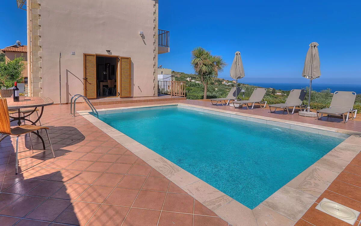 "Larena", 3-værelse-villa på 2 etager. Rummelig og lys, komfortabelt og pæn indrettet: åben stue/soveværelse med 1 sovesofa og TV (fladskærms TV). Udgang til terrasse, til pool. Åbent køkken (ovn, 4 keramiske kogeplader, kedel, mikroovn, elektrisk kaffemaskine). Brus/WC. Klimaanlæg. Overetage: (trappe uden gelænder) 2 dobbeltværelse, alle værelser med 1 dobbeltseng. Udgang til altan. Brus/WC. Klimaanlæg. 2 altan, stor terrasse. Grill. Flotte udsigt over havet og landskabet. Til benyttelse: strygejern hårtørrer. Internet (trådløs LAN [WLAN], gratis). Bemærk venligst: ikke-ryger hus. 1034197