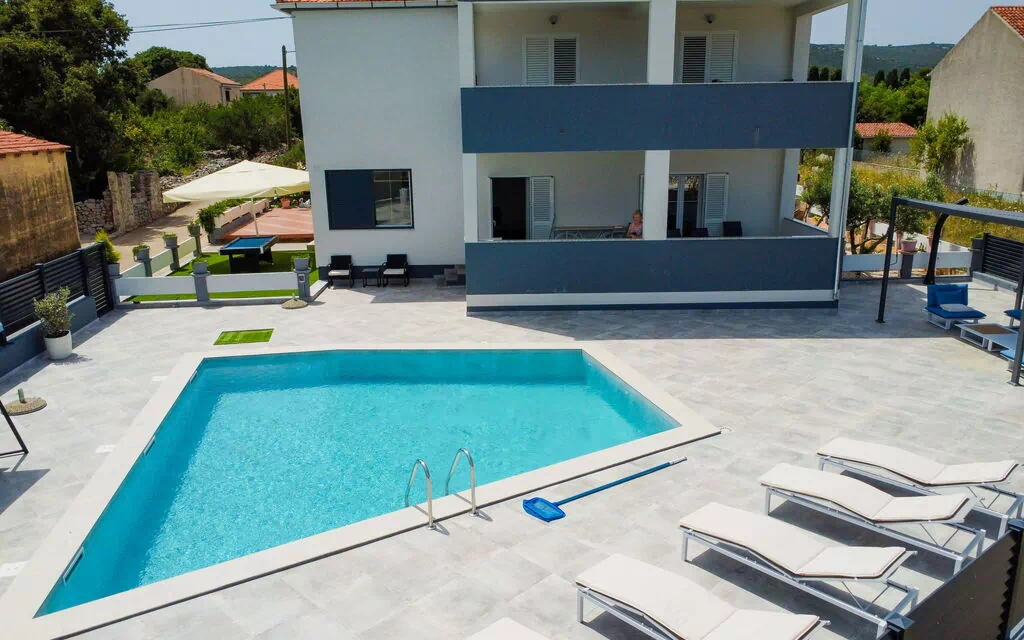 Moderne, lille lejlighedshus "Franka". I byen, rolig beliggenhed, 10 m fra havet, 20 m fra stranden. Til alene benyttelse: grund 400 m2, pool (7 x 7 m, 49 m2, 145 cm dyb, Sæsonbestemt tilgængelighed: 01.Maj. - 01.Okt.). Udendørs brus, pergola, havemøbler. I huset: adgang til internet, aircondition. Parkeringsplads ved huset. Indkøbsforretning 15 m, restaurant 20 m, busstoppested 9.4 km. Tennis 300 m.