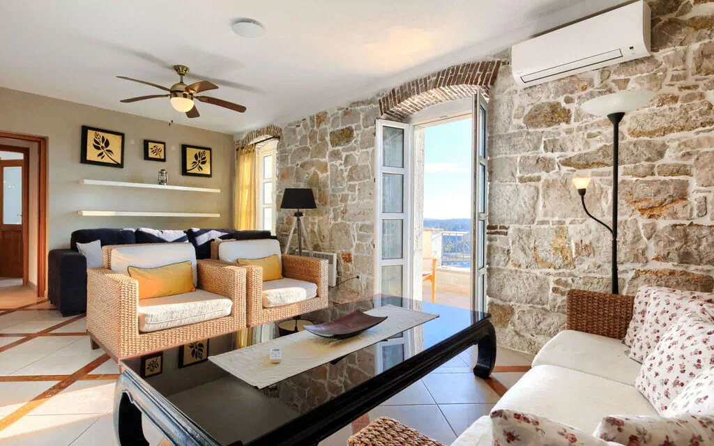 3-værelse-lejlighed 86 m2, i stueetagen. Hyggeligt indrettet: stue/spisestue med 1 sovesofa (160 cm, længde 200 cm), sat-TV og klimaanlæg. Udgang til altan, til terrasse. 1 værelse med 1 fransk seng (160 cm, længde 200 cm), bad/brus/WC. Udgang til terrasse. 1 værelse med 1 fransk seng (160 cm, længde 200 cm). Åbent køkken (4 kogeplader, opvaskemaskine, mikroovn, fryser). Særskilt toilet. Terrasse 15 m2. Havemøbler. Flotte udsigt over havet. Til benyttelse: hårtørrer. Internet (trådløs LAN [WLAN], gratis). Maksimum 3 husdyr/hunde tilladt.