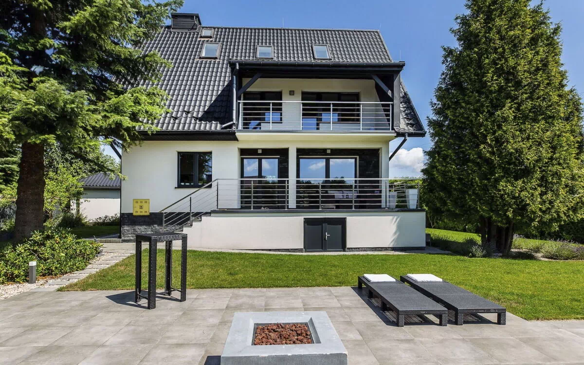 Moderne enfamiliehus "Chrosna", på 2 etager, bygget i 1996, renoveret i 2019. Uden for byen. Til alene benyttelse: grund, have, græsmark. Legeplads. I huset: trådløs LAN [WLAN], fitnessrum, boblebad, alarmanlæg, vaskemaskine, tørretumbler. Tilkørsel til til huset. (7 trin). Parkeringsplads ved huset.