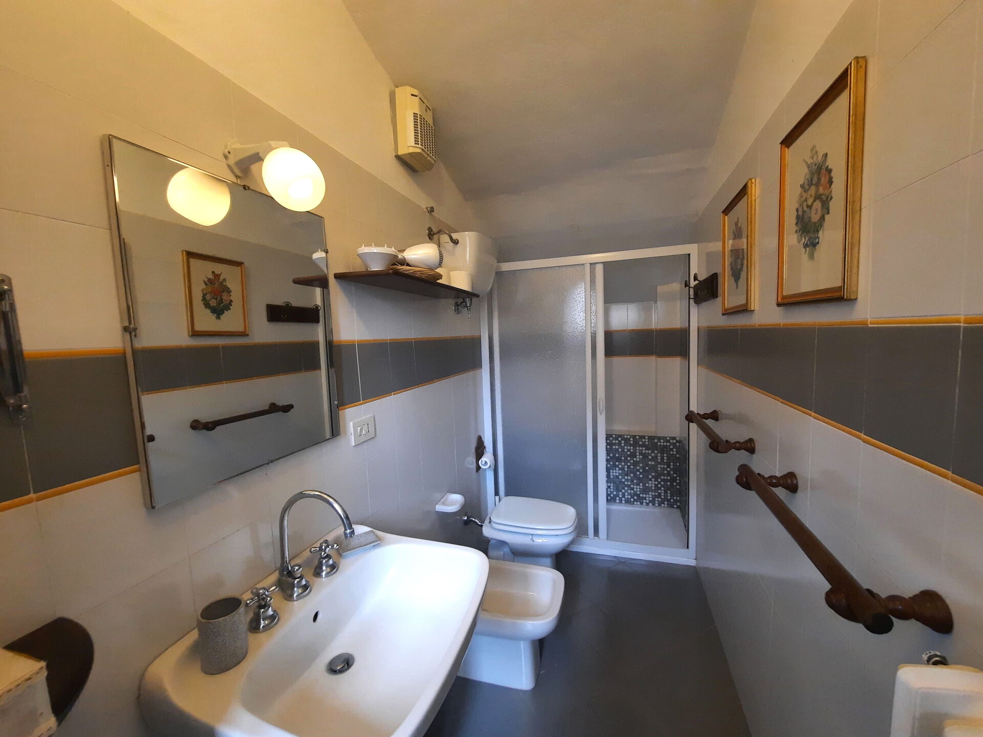 Badeværelse: vask, wc, bidet, bruser, hårtørrer, internet, uden vindue.