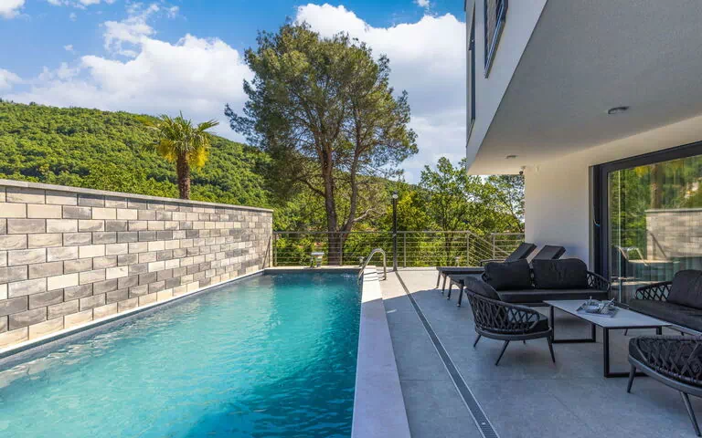 Dobbelthus "Villa Visum Mare Unus", på 3 etager. 500 m fra bymidten af Mošćenička Draga, solrige beliggenhed, fra havet, 700 m fra stranden. Til alene benyttelse: grund 530 m2 med planter, pool kantet, med varme (9 x 3 m, 140 cm dyb, Sæsonbestemt tilgængelighed: 15.Apr. - 30.Okt.). Udendørs brus. I huset: adgang til internet, sauna, boblebad, centralvarme, alarmanlæg, vaskemaskine, tørretumbler. Parkeringsplads (for 2 biler) ved huset på grunden. Indkøbsforretning, supermarked 650 m, restaurant 100 m, busstoppested 280 m, stenstrand, strandliggende pool 700 m.
